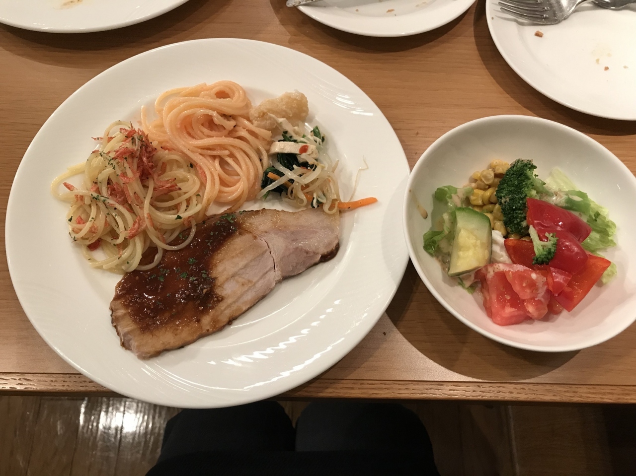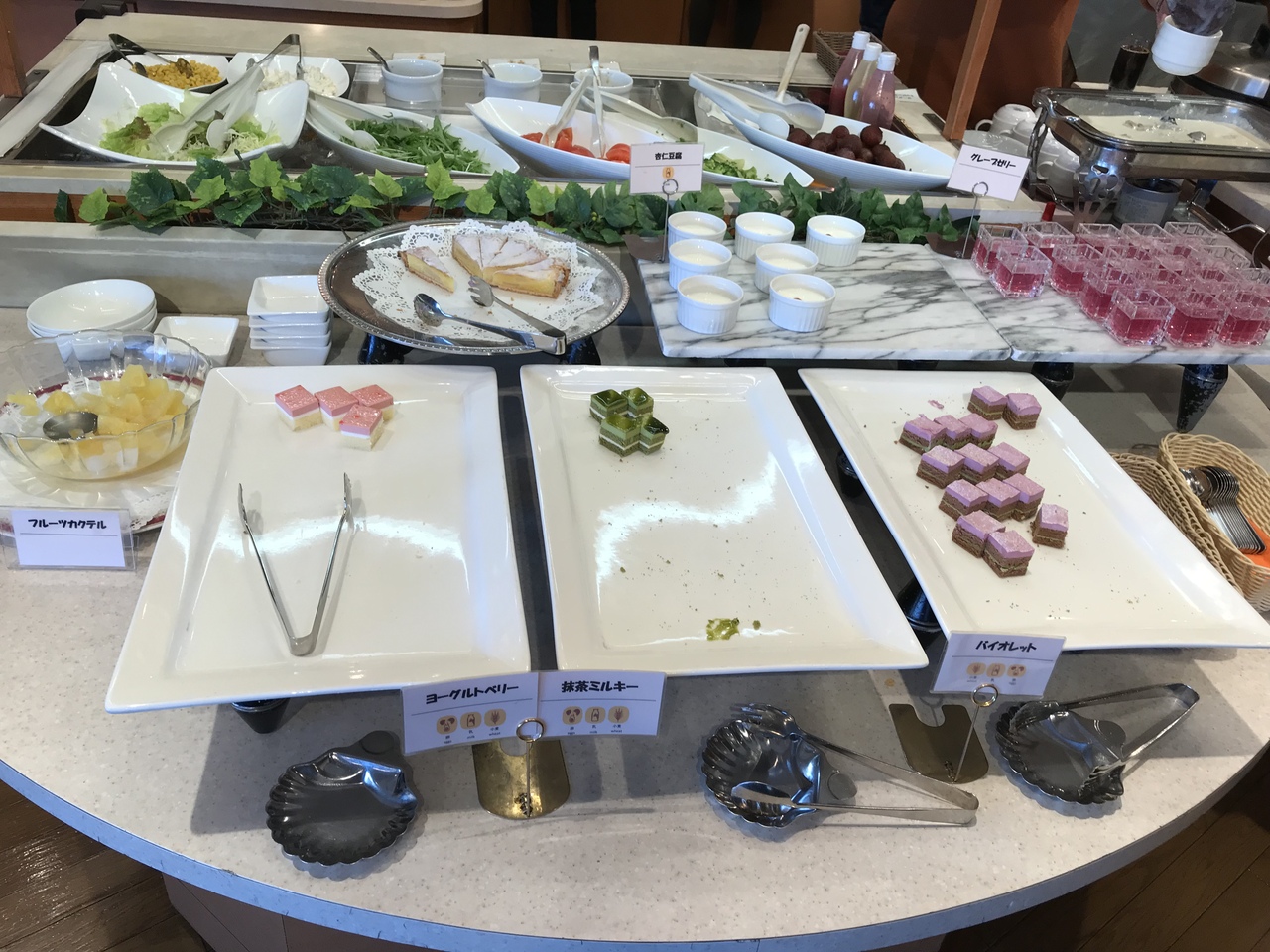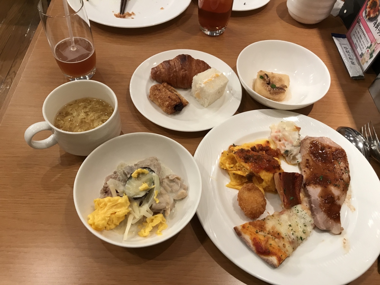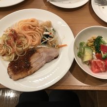 そんなに、品数が多い方ではないですが、どれも味は良かったです。お肉は豚ロースのみ、パスタ二種類、ピザ二種類、冷やしうどん、カレー、サラダ、小さめケーキに杏仁豆腐、ゼリーとスイーツは美味しかったです。この日は新春ちらし丼がありましたが、嫌いなので食べませんでした。