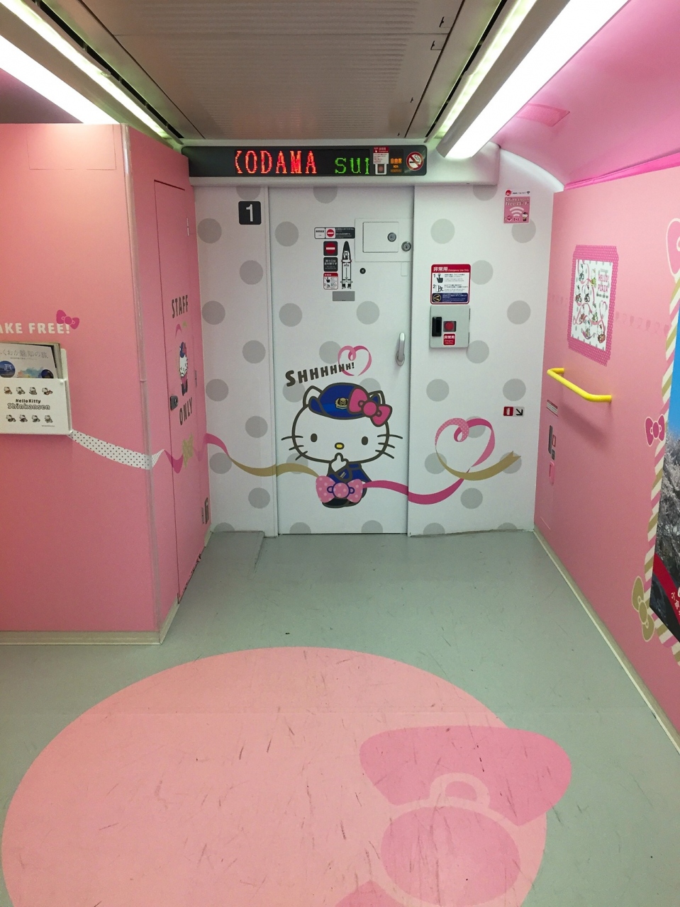 座席やサンシェイドまでハローキティ仕様になっているのは、自由席でもある2両目のみ。 3両目以降は内装はごく普通のこだま号です。