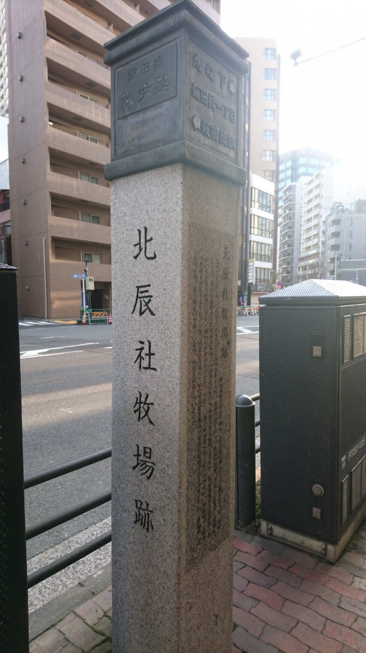 飯田橋駅から目白通りを南に10分ほど歩いたところに北辰社牧場の石碑がありました。これは幕臣として西洋の知識を学んできた榎本武揚が函館で新政府軍に敗れた後、この地に開いた北辰社牧場を記念したものです。当時は牛乳は新しい飲み物であり、榎本武揚の知識を新政府が活かしたのだと思いました。こんなところに牧場というのは意外でした。