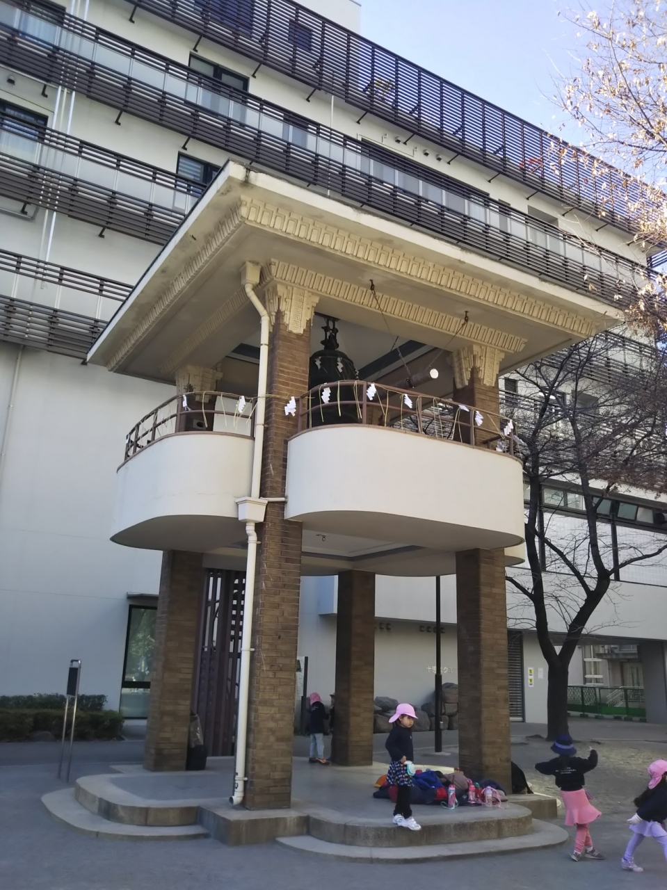 地下鉄小伝馬町駅近くの十思公園の中に在ります。確かに鐘は吊り下がっているのですが、かなり高い位置に在って、下からは見え難いです。と言うかコンクリート造りで鐘堂というイメージでは有りません。階段も鉄筋の螺旋状ですし、滑り台が付いててもおかしくないですね。