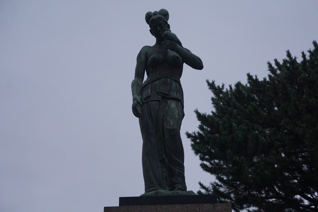 体育館と通りを挟んだ豊川公園側の一角にある平和の像。傍らに「平和都市宣言」という碑があって、太平洋戦争の末期、豊川海軍工廠の被爆によって動員学徒や女子隊員2500名が命を落としたとありました。核被害のことにも触れられていて心が痛みました。