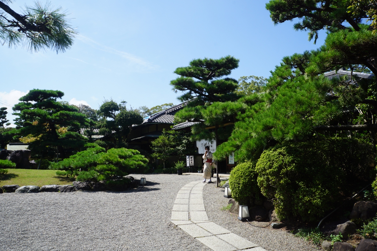 今は、がんこ寿司のお店が入っていますが、これは、岸和田城二の曲輪の新御茶屋、薬草園の跡地に旧寺田財閥当主家別邸として建設された建物を引き継いだもの。門から中を覗くだけでも、緑の濃い松の植栽などその威風堂々とした構えが素晴らしいです。