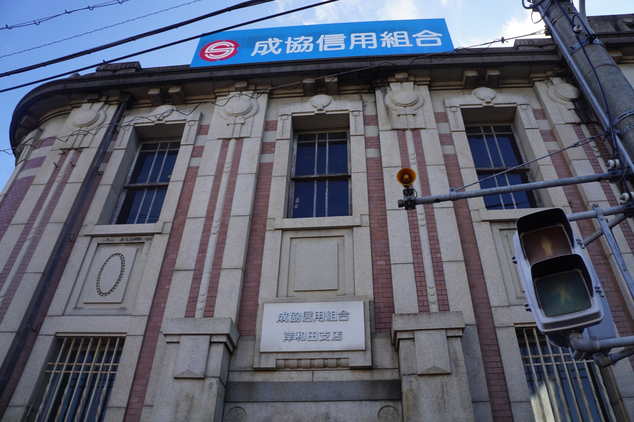 成協信用組合岸和田支店は、赤いレンガと白い花崗岩のツートンカラー。大正8年に、旧四十三銀行として建った建物。ツートンカラーから、設計者は東京駅を設計した辰野金吾ではないかという説もあるようですが、まあ微かに似ていなくもないという感じ。窓の鉄格子のの部分がちょっと古びていて、それで建物全体が傷んでいる印象になっているのが残念です。