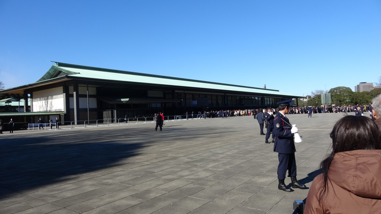 皇族の方々がお目見えになる宮殿は端から端までガラス張りです。でも作りは和を重んじてか、日本的古風であるし、少々モダンな外観でもありますね。それでも天皇陛下の御住まいなので荘厳さも感じます。国民が旗を振り集まる場所は本来広すぎると言っていいくらいですが、参賀になるとぎゅうぎゅう詰めです。