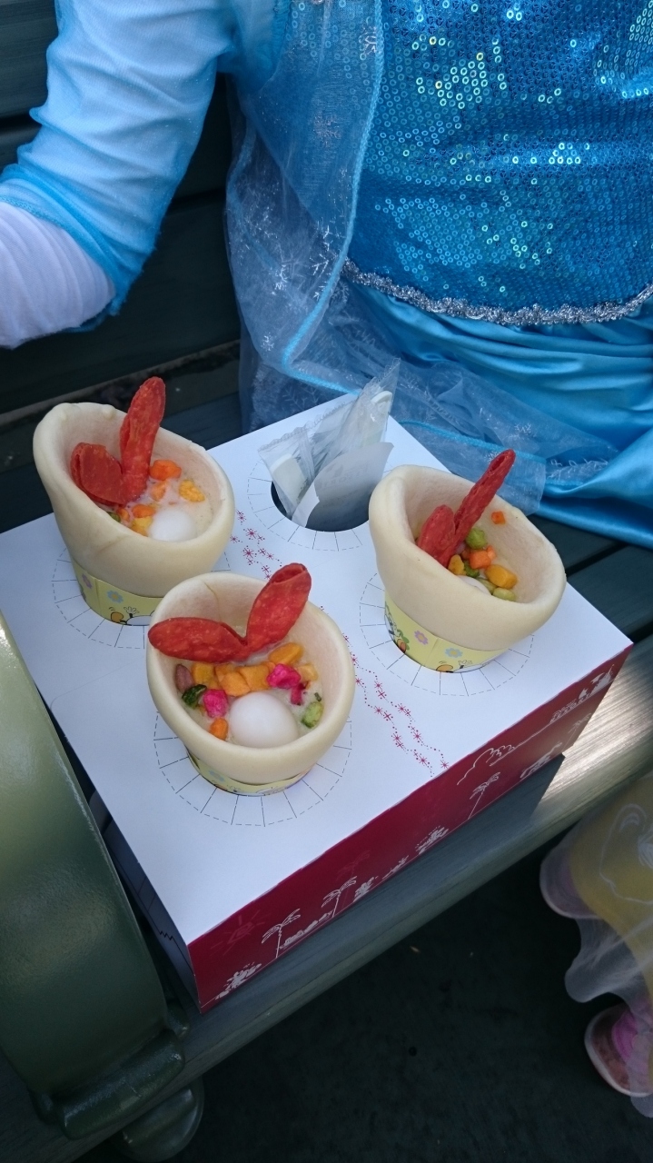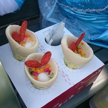 今回はイースター風で、周りのコーンの部分が肉まんの生地みたいなパン風、中身がクリームシチューでした。