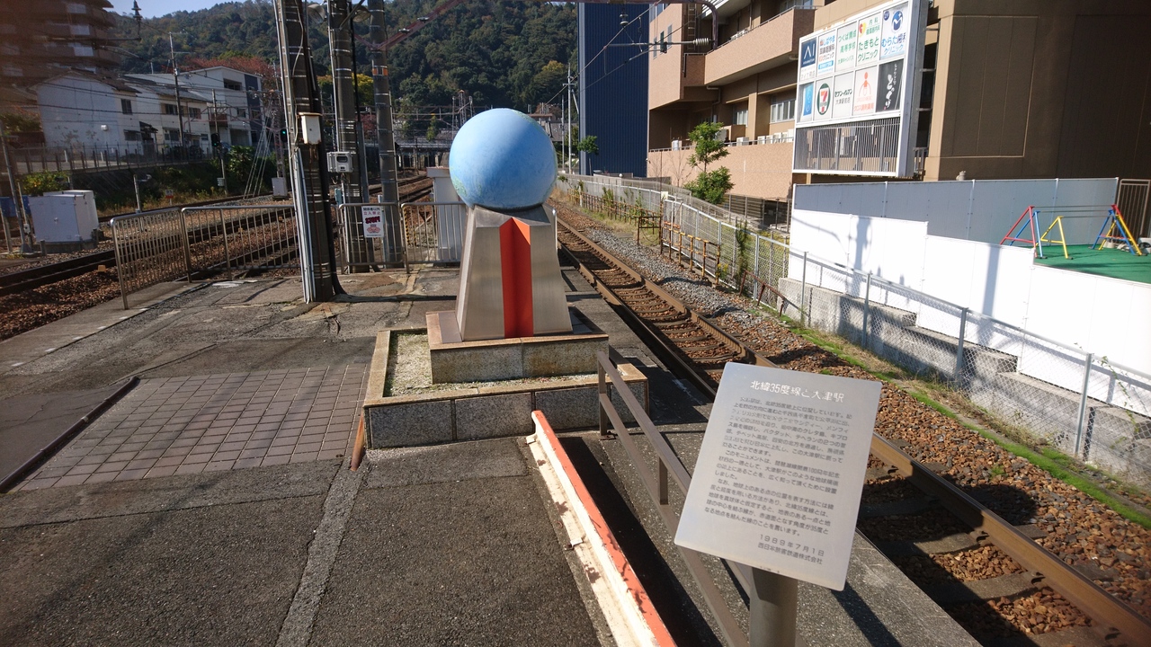 大津駅は北緯35度線上にあり、このモニュメントがありました。