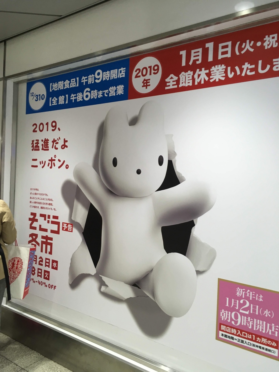 三ノ宮駅前唯一の百貨店はそごう神戸店。いまは名前はそごうですが、運営は阪急になっているので、お店の内容もかなり変わりつつあります。西武やそごうのセールやキャンペーンはもうこのお店は対象外になっているので、初売りでもお買い物くまグッズプレゼントはありませんでした。