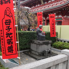 浅草寺の山門である宝蔵門を正面に右手に赤い幟が立つ、石柵に囲われた所に、赤子を抱き負ぶった母子像があります。これが母子地蔵尊です。満洲国で第二次大戦末期に逃避行の末に命を落としたり、生き別れた母子を慰めるために建立されたものです。悲しい歴史を物語る地蔵として後世に伝える仏像に思わず合唱しました。