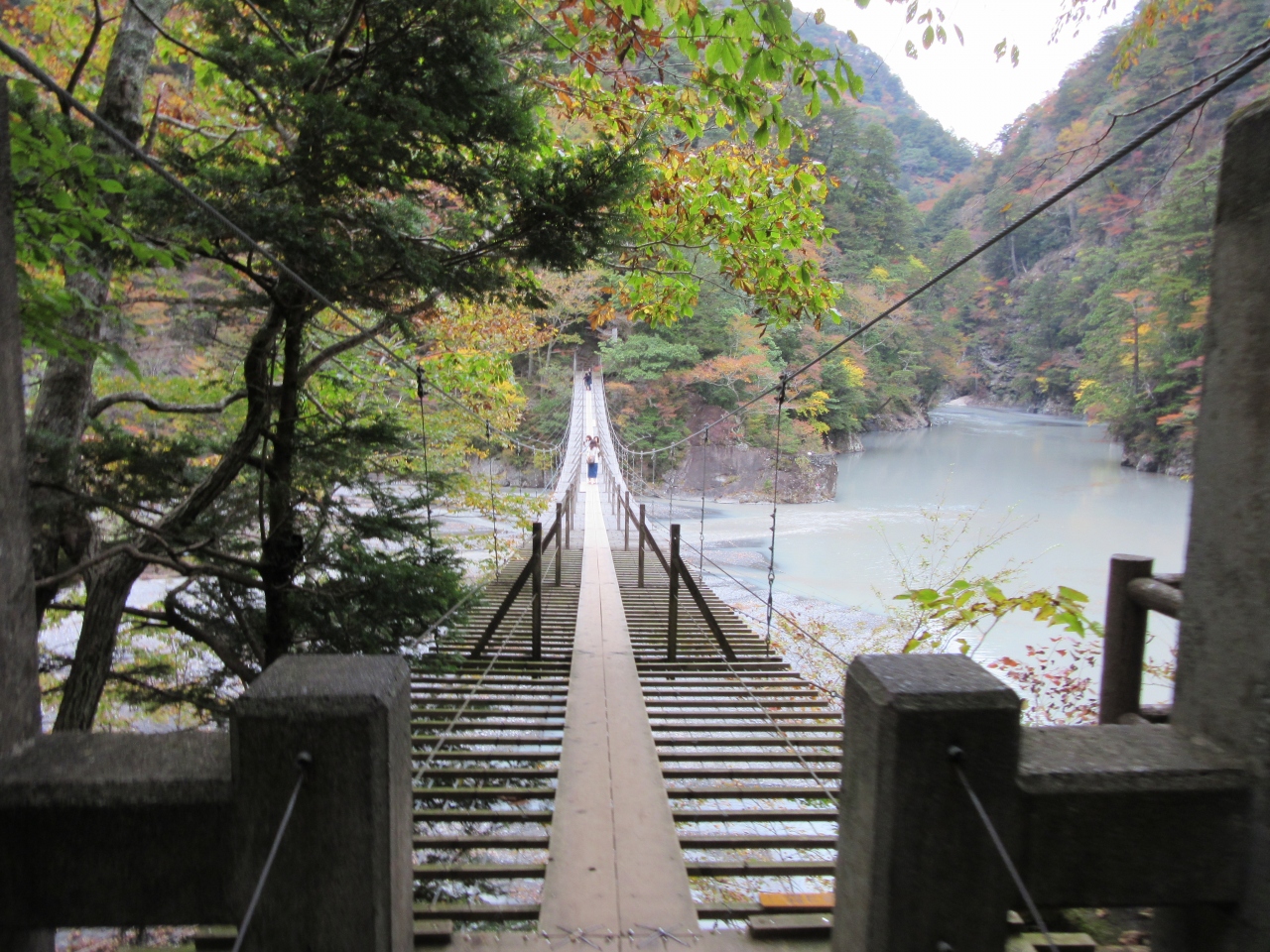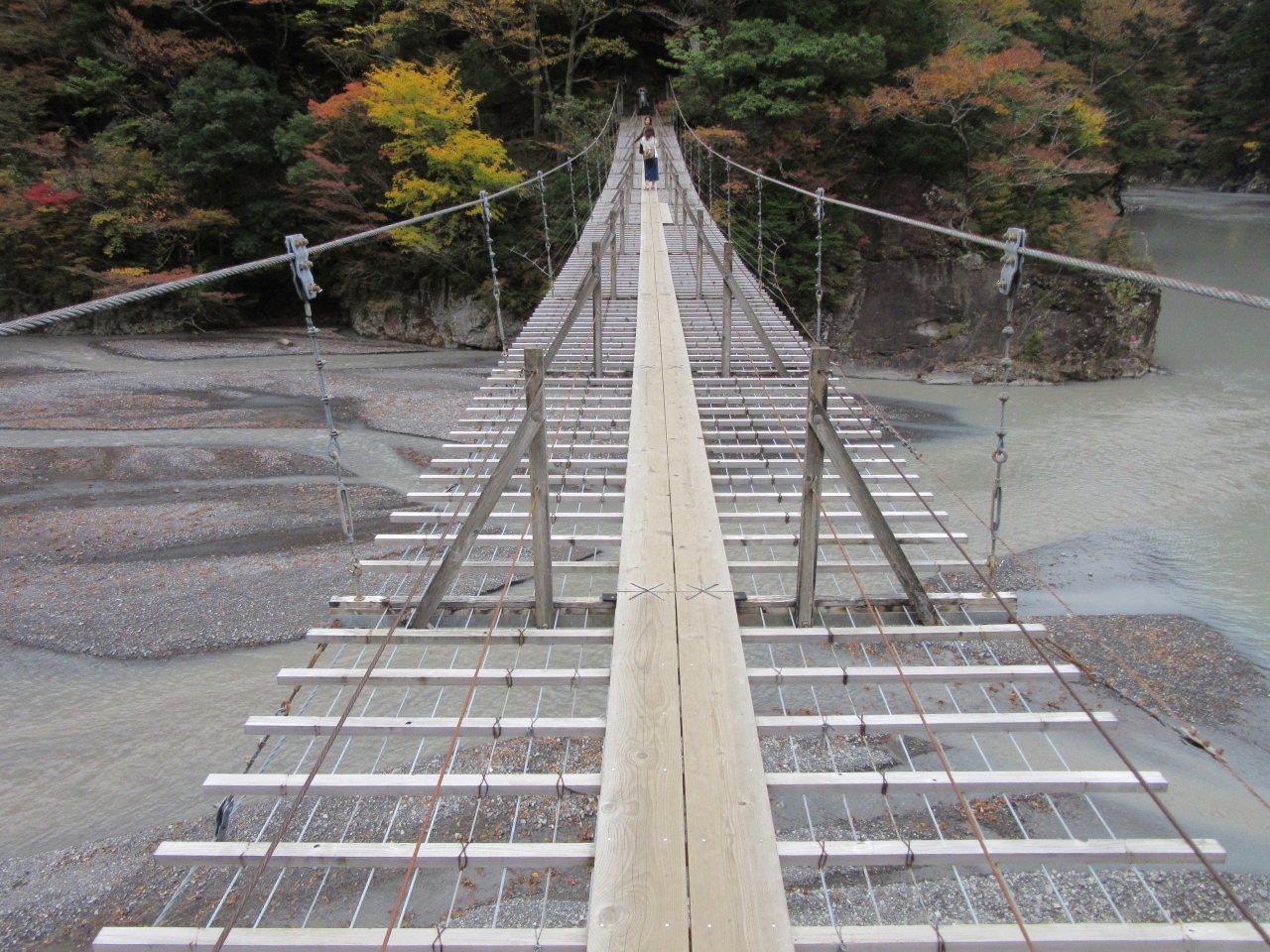 吊橋直下の湖面は本来はエメラルドグリーンの非常に美しい湖面の筈なのですが、訪問時は非常に残念な色でした。今年は台風の当たり年で、濁流が流れ込み水質が回復しないそうです。
