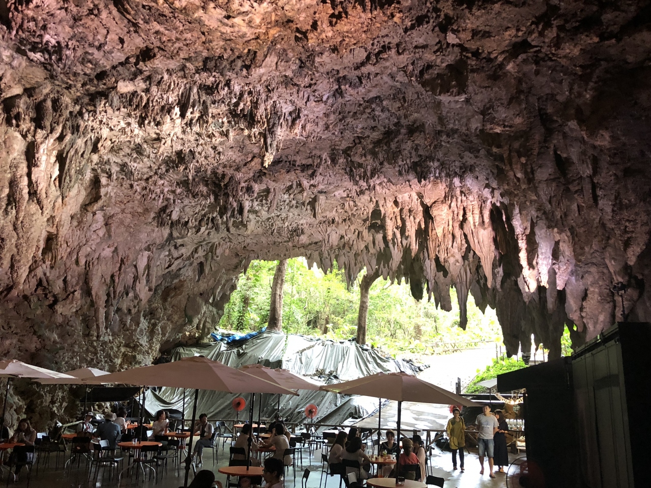 洞窟内に作られたカフェです。圧巻です。上から水が垂れてくるので、パラソル付きのテーブルとなっています。
