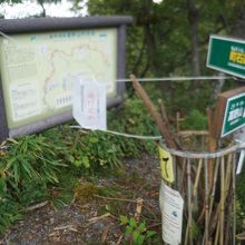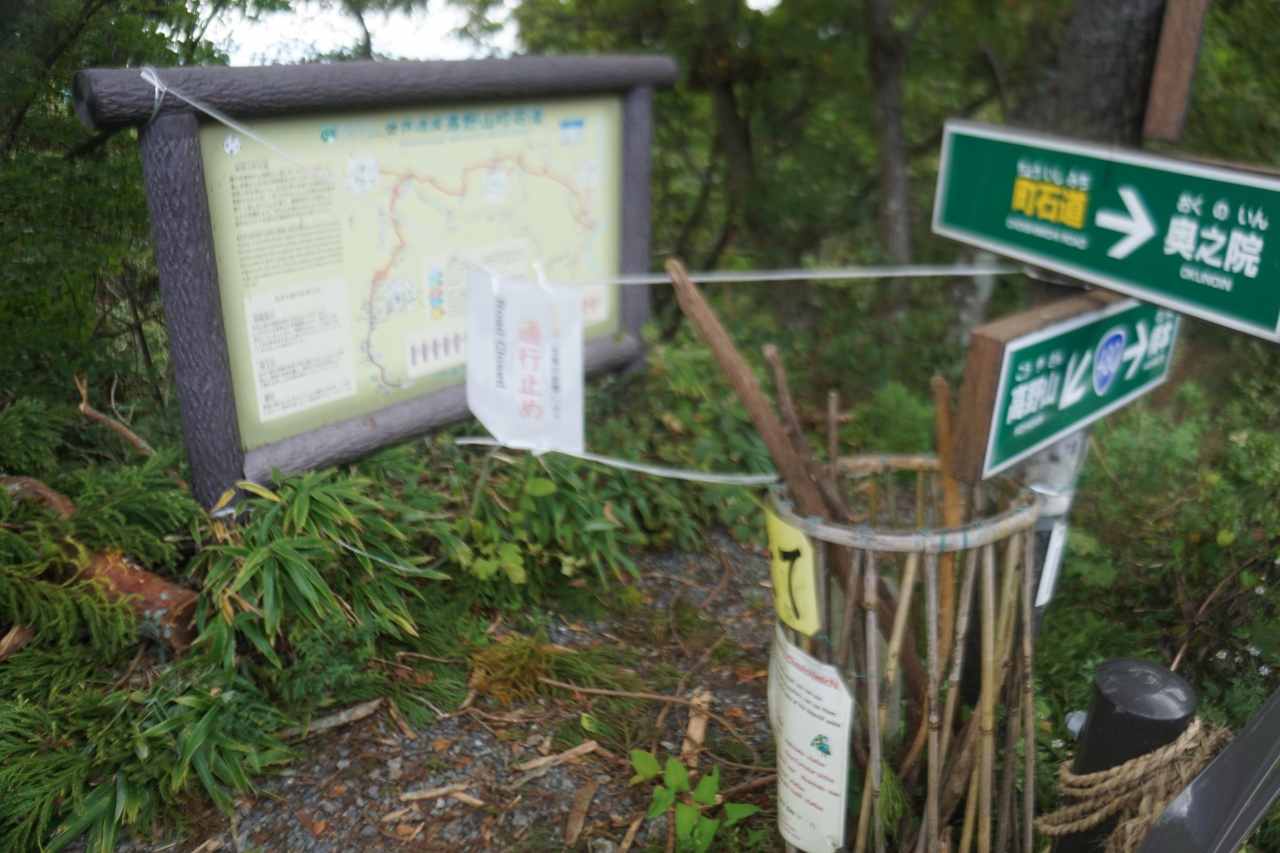 町石道は、九度山から高野山を結ぶ山の道。大門のところに下っていく道の入口と地図が立っていましたが、けもの道に毛が生えたくらいの難儀な道。杖がたくさん置いてあるのも、それをよく物語っています。また、直近の暴風雨の影響で閉鎖されていました。