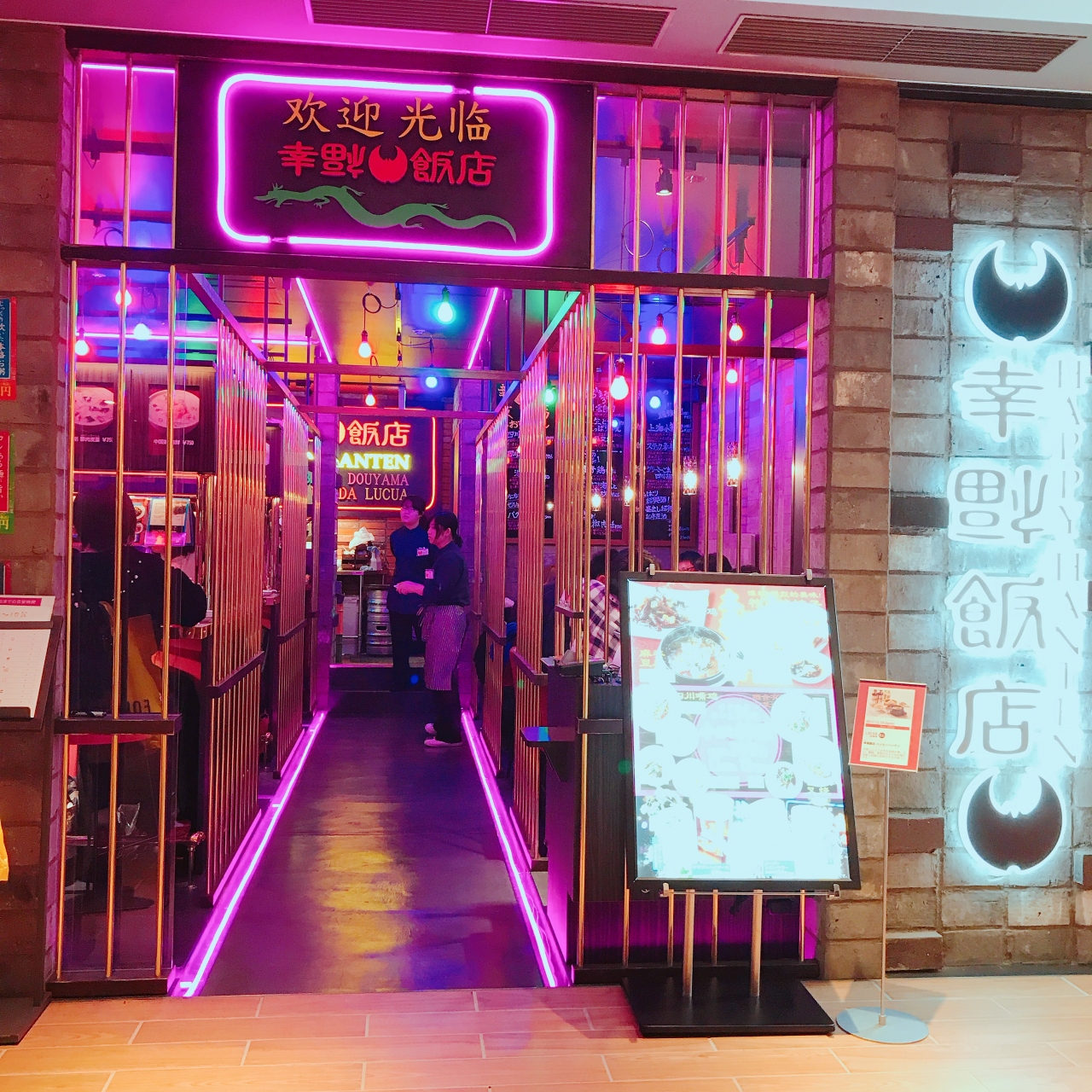 ルクアの地下にある幸福飯店です。なんとも映え映えなお店ですよね。このネオンの店内がポップでええですね。ポーションが小さいのでちょっとづついろんな味を楽しめるのがいいですよね。なんだかんだでマーボ豆腐がおいしい