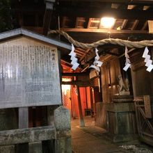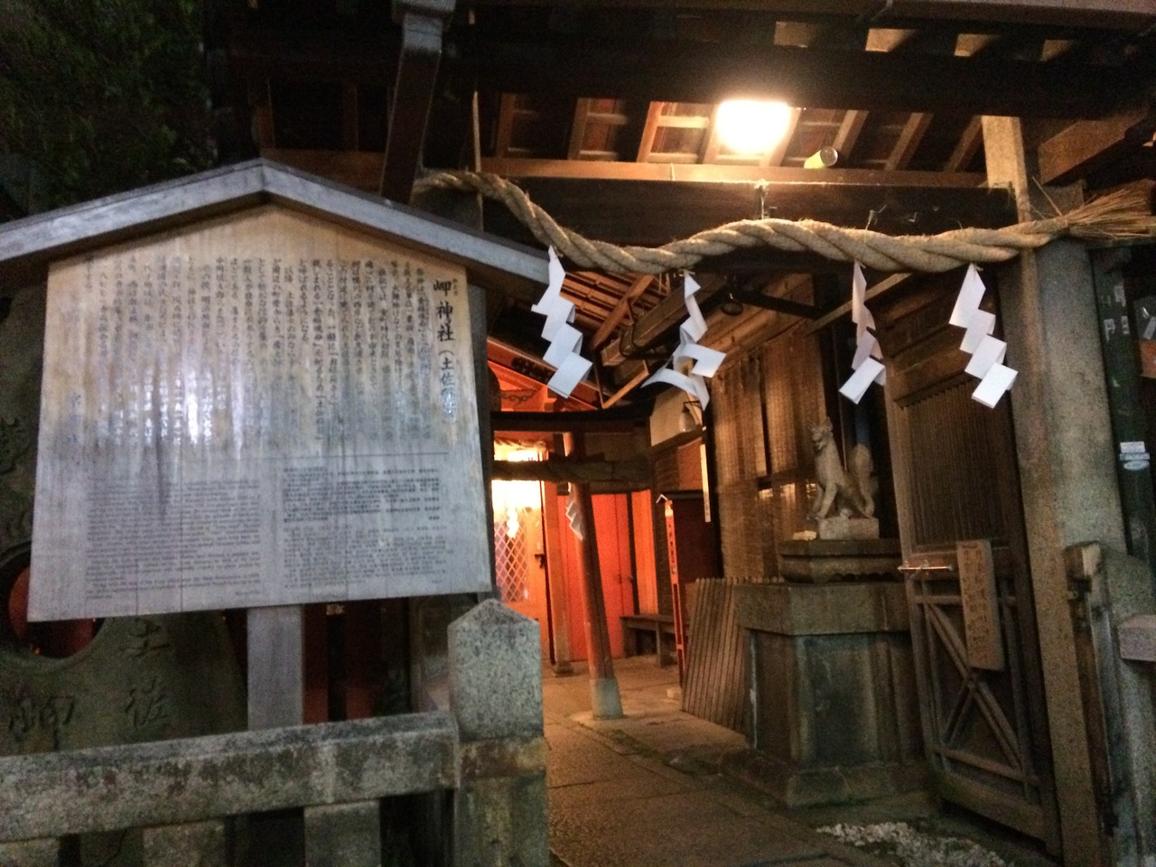 南北に走る河原町通りと木屋町通りを東西に結ぶ小道沿いに土佐稲荷が立地しています。2メートルもないような門をくぐり抜けると、2匹の狛犬、そしてその奥に小さな鳥居がありました。左手には坂本龍馬の銅像が建立されていました。日没後だったのでとても暗く、境内の面積はとても狭くコンビニの半分もないくらいに感じました。