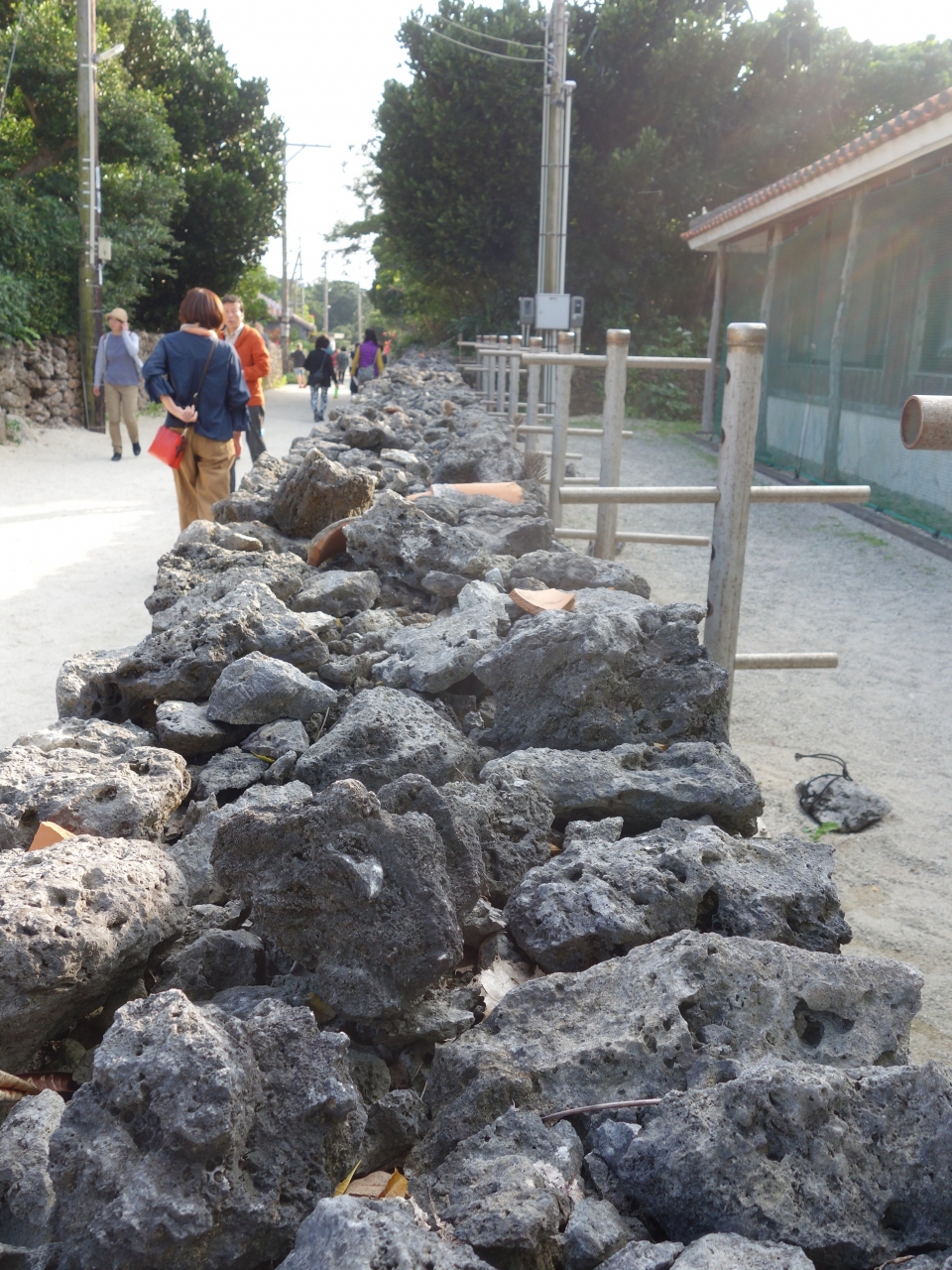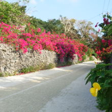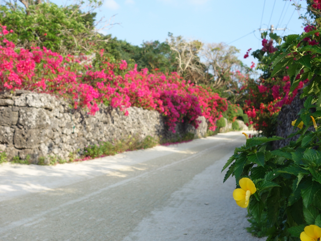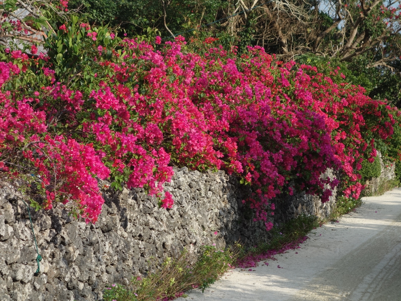 竹富島の集落の生存方法が街歩きをしているとわかります。石垣がすごいのです。そう,台風の強風対策です。そんな強固な石垣で,集落が守られているのです。しかし,お花も見られます。強さと優しさの両面が見られる集落です。いいところです。