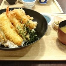 北関東自動車道上三川IC降りてすぐのショッピングモール「FKDインターパーク店」1階にある店舗です。お昼時に訪れたので店内の食事処はどこも並んでいました。こちらは比較的空いてそれほど待たずに席につけました。決めるのに悩んでしまうくらい豊富なメニューでしたが、そのなかで天丼と海鮮丼をいただきました。天丼の天ぷらの衣がサックと言うよりは硬めの天ぷらでした。