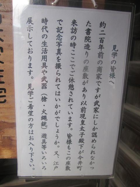 江戸時代の街並みが残る今井町域の東側、中尊坊通り沿いにある旧家の一つで、元々は「大東の四条屋」という屋号で酒造業を営んでいた所です。すぐ隣の河合家も酒造業家で、現在もお酒の販売を行っていますが、こちらは今は酒屋としての雰囲気はありません。但し、内部見学は予約なしに出来るとのことでした(有料)。こちらも重要文化財建築の一つなので、予約が面倒な方で、旧家の内部にご興味をお持ちの方は、こちらに足を運ばれると良いかなと思います。
