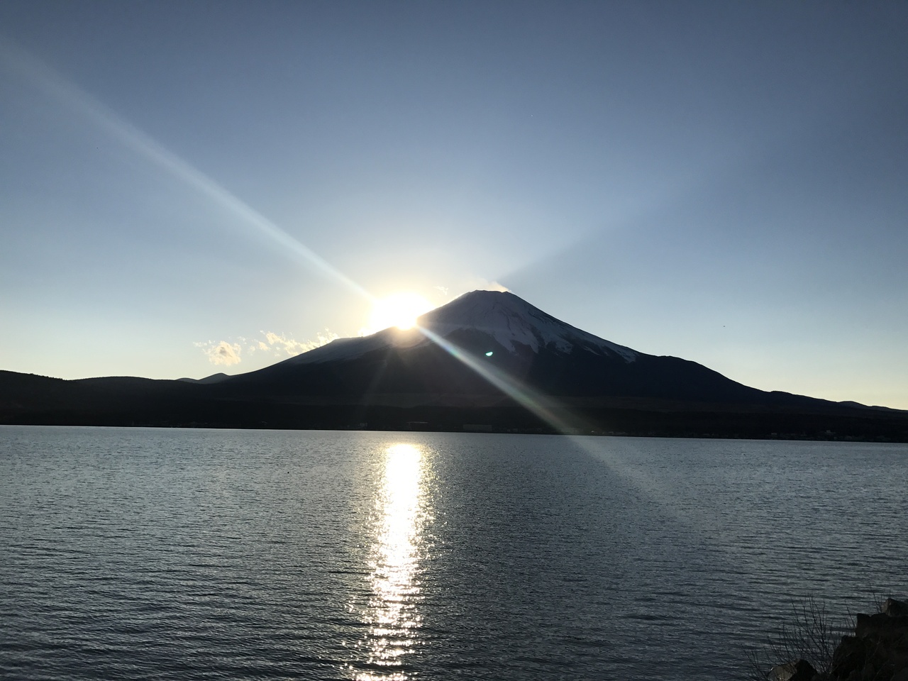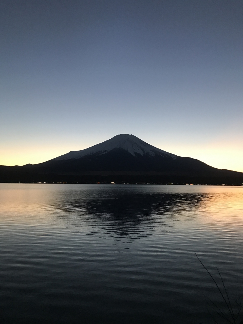 晴天の冬の夕方に山中湖畔から撮影しました。山の左肩あたりに陽がかかり始めると、1・2分で太陽が見えなくなってしまいました。その後食事をしてからまた湖畔に行くと、夕陽のオレンジ色を背景に影絵のように浮き彫りになった富士山の姿が神々しかったです。