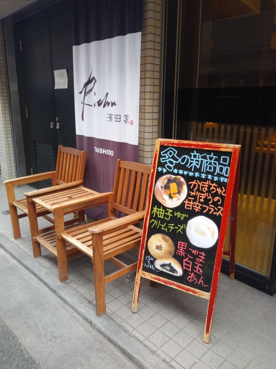 和風ののれんのかかったかっこいい店舗です。濱田家は店舗によって商品が違ったりして面白いですがこちらは特にこちらにしかないパンが多いです。和風のパン屋さんですが、パンそのものよりもお惣菜の具材が和風です。