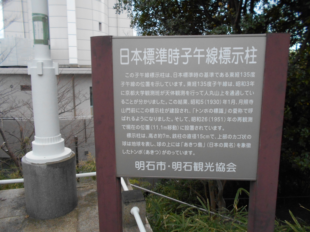 柿本神社、月照寺、亀の水など、明石市立天文博物館(日本で一番古い大型プラネタリウム)など回ると良い。明石市立天文博物館はオウラネタリウム投影時刻が決まっており、屋上から出口専用扉で日本標準時子午線表示柱、柿本神社側に出られるので、順路を考慮。