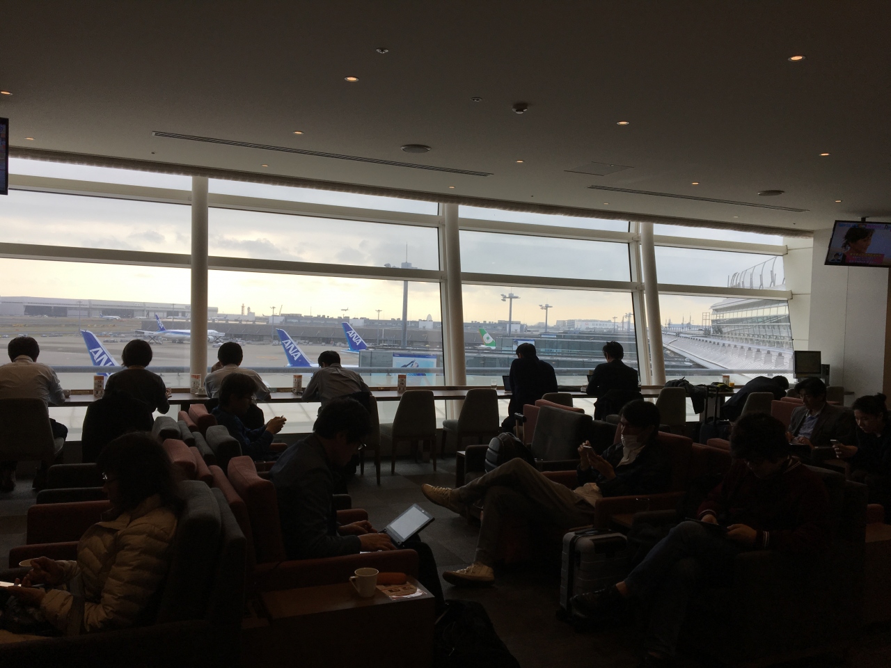 聞いてはいたけれど航空会社のラウンジに比べると、狭くてセルフでいただける飲み物があるだけで、その割には混んでいてあまりゆっくり過ごせる感じではありません。