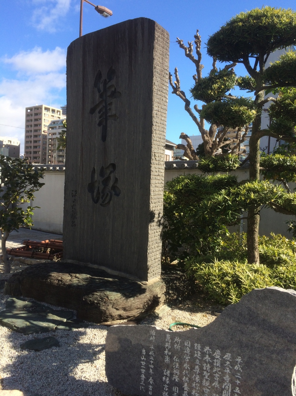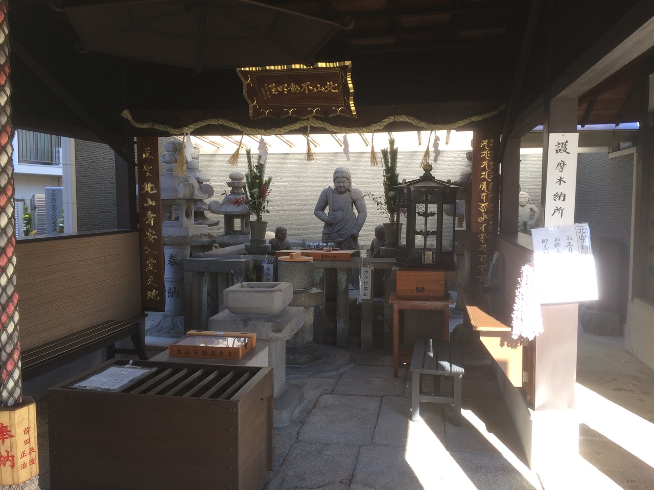 出入口は2箇所ありました。筆塚、針塚等の塚の立派な石碑が建っていました。お墓は奥側にあり、手前には北山不動明王が参拝客を睨みつけているような像でした。本殿が横長の寺らしくない家のような作りでした。十三参りの寺でもあります。