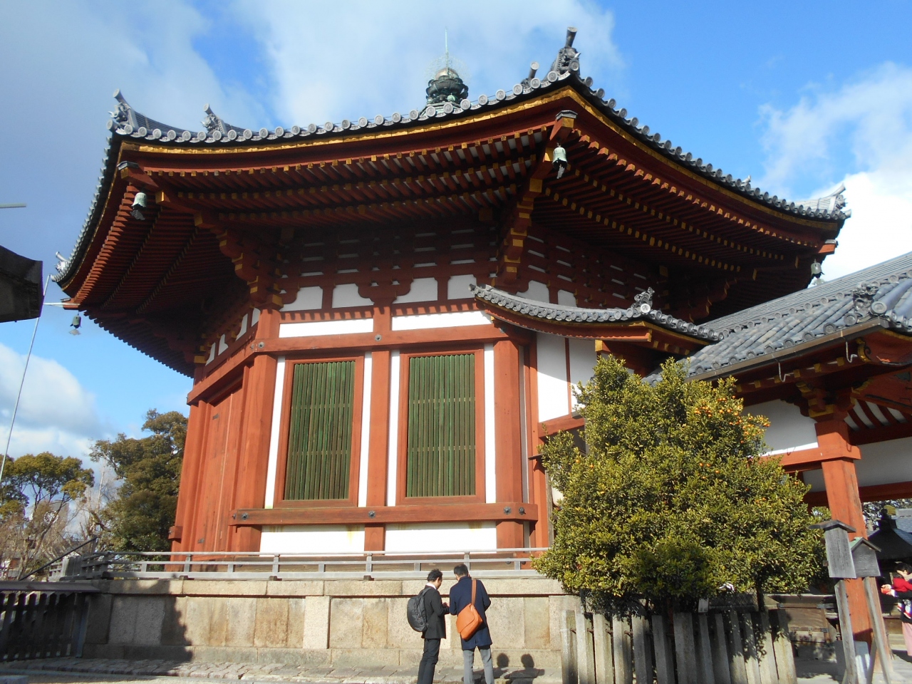 江戸時代の再建ではあるが日本最大の木造八角円堂は、大きさも迫力十分で、色づかいもはでな感じで、参拝する人も多い。