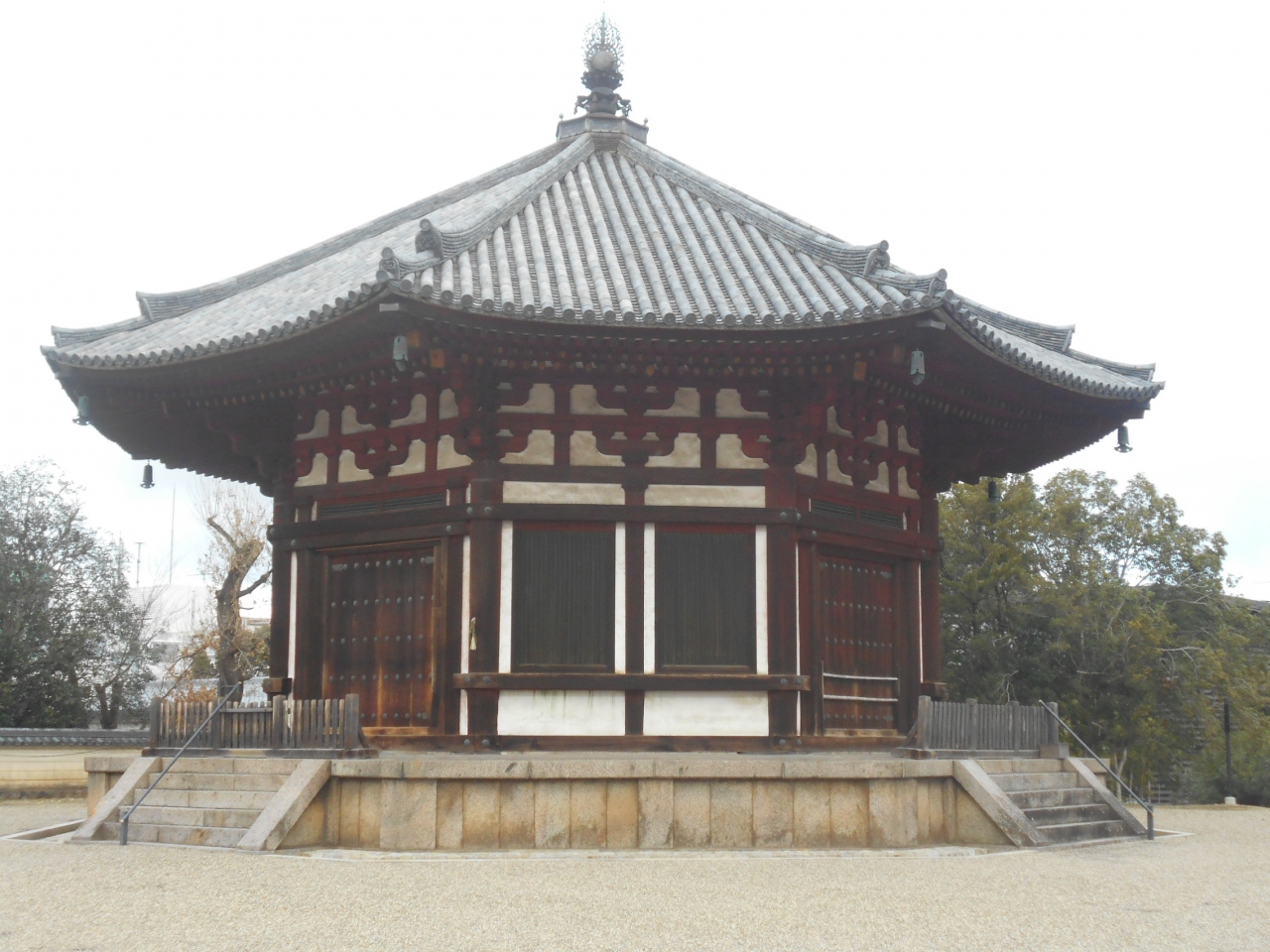 入口に近い南円堂のような色の派手さと、迫力はないが、地味な中にも優美な北円堂は、静かに建っている。こちらは鎌倉時代初期の再建といわれ、奈良の様式を残しているので優美に感じるのであろう。柵の中にあって、近寄れないのが惜しい。
