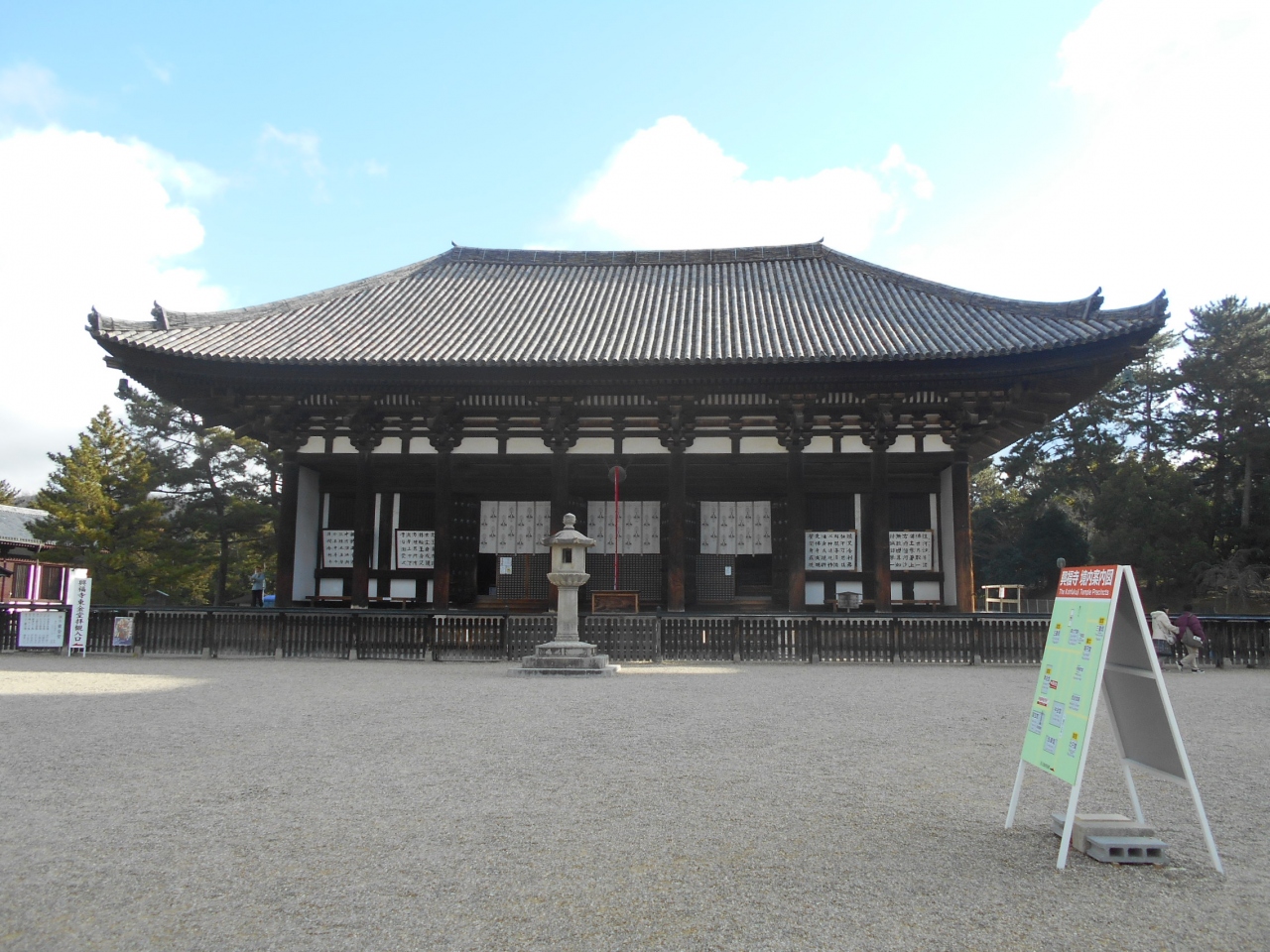 金堂の瓦葺屋根大棟の両端につけられた鴟尾(しび)がないので、見劣りするし、正面い燈籠が置かれているのも不思議な感。