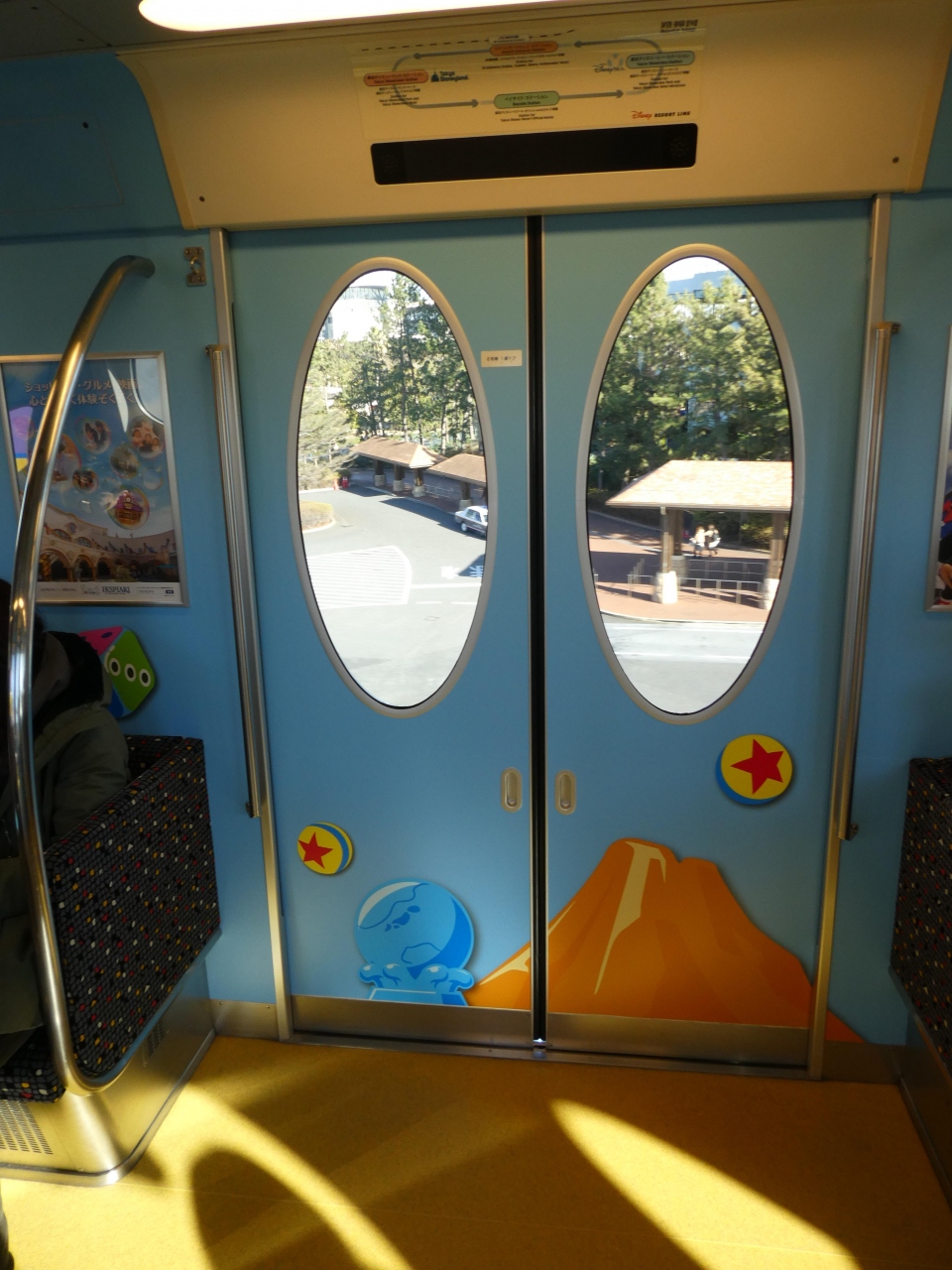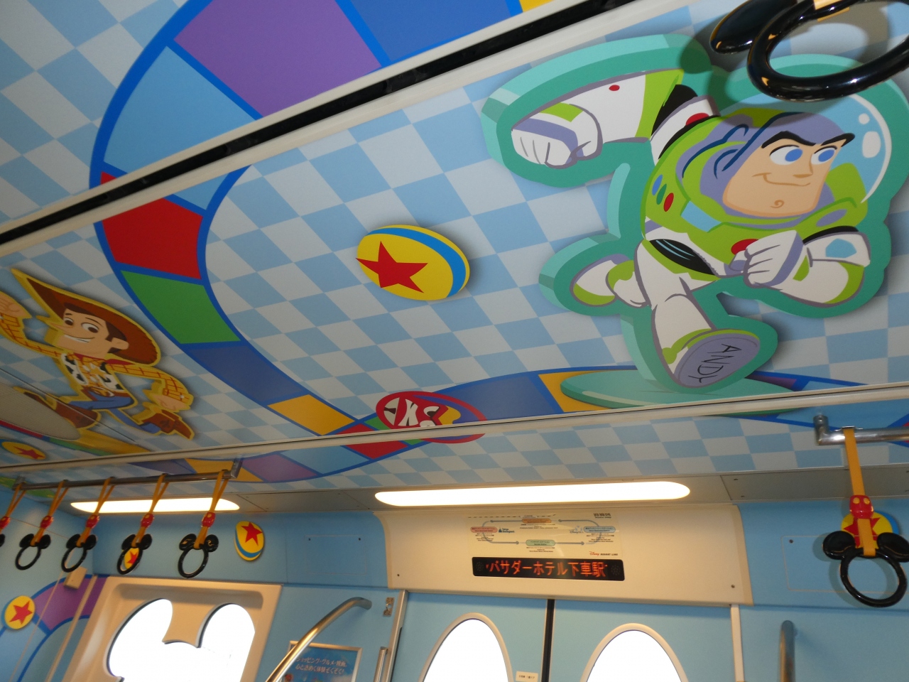 車内は、天井には、トイ・ストーリーのバズライト・イヤーなどのピクサー映画のキャラクター達が描かれています。