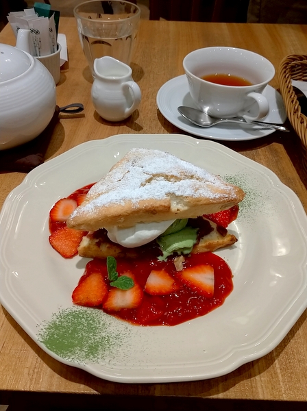 オーダーしたのは季節限定イチゴのメニューから苺と抹茶あずきのスコーンショートケーキを