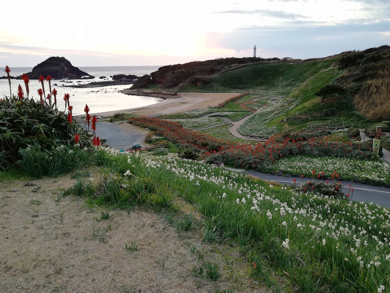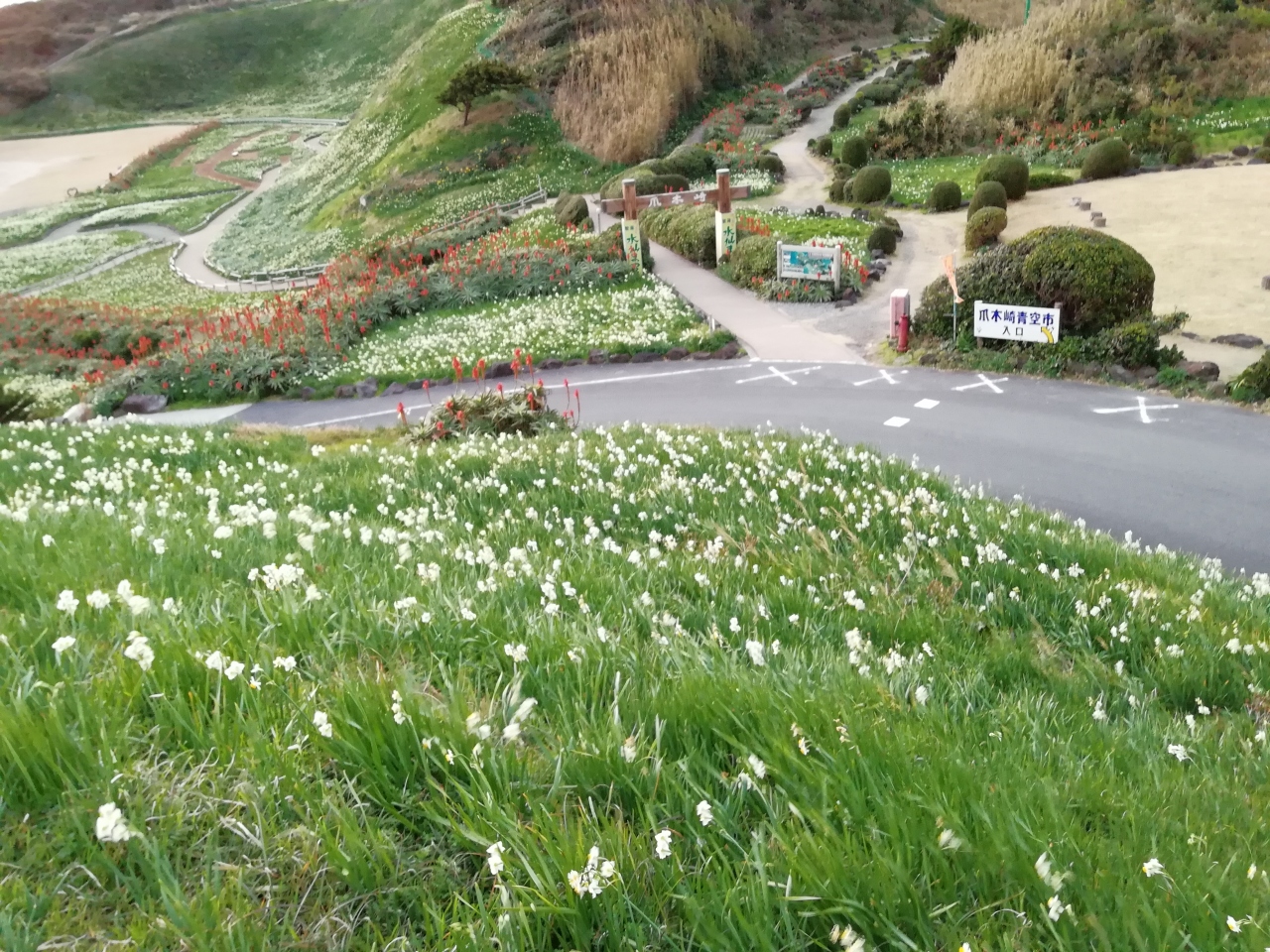 早朝の伊豆ドライブで下田の手前にある爪木崎に立ち寄りです。須崎半島から突き出した岬。駐車場から遠くの白い灯台と伊豆七島が見えます。駐車場は有料との事ですが、かなりの早朝でしたので係の方が不在でした。スズキ自動車のCMでロケ地に使われていますね。CMと同じようなアングルで写真がとれました。ちょうど水仙まつりの最中で、白い水仙の花が咲いていました。