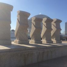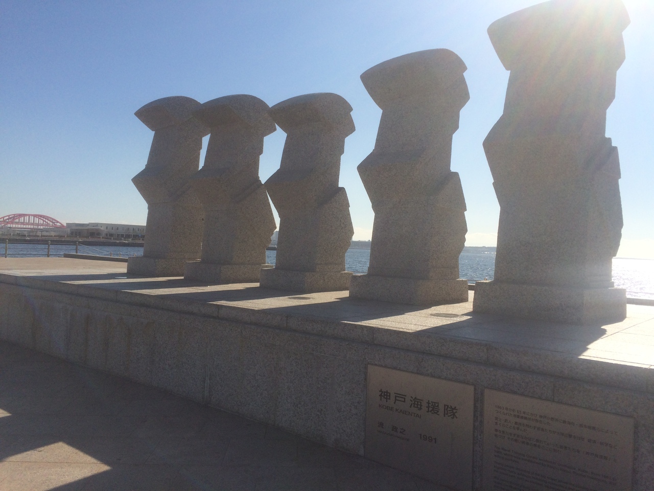 勝海舟、坂本龍馬らによって作られた海軍操援所の碑で、若者たちが経済、文化等を学んだとのことでした。沿岸に面していて、少し遠くから見るとモアイ像のように見えました。5つの像が同じ形で何を表しているかわからなかったです。