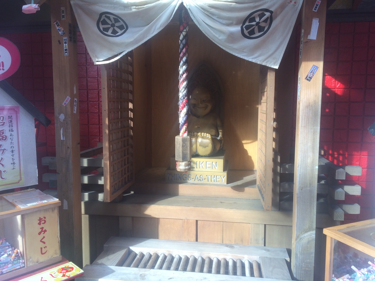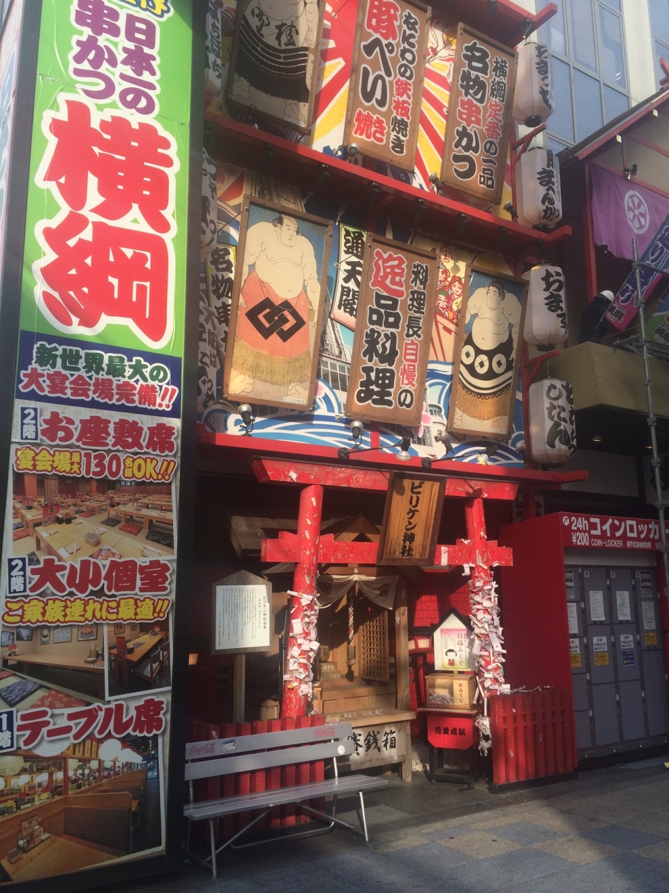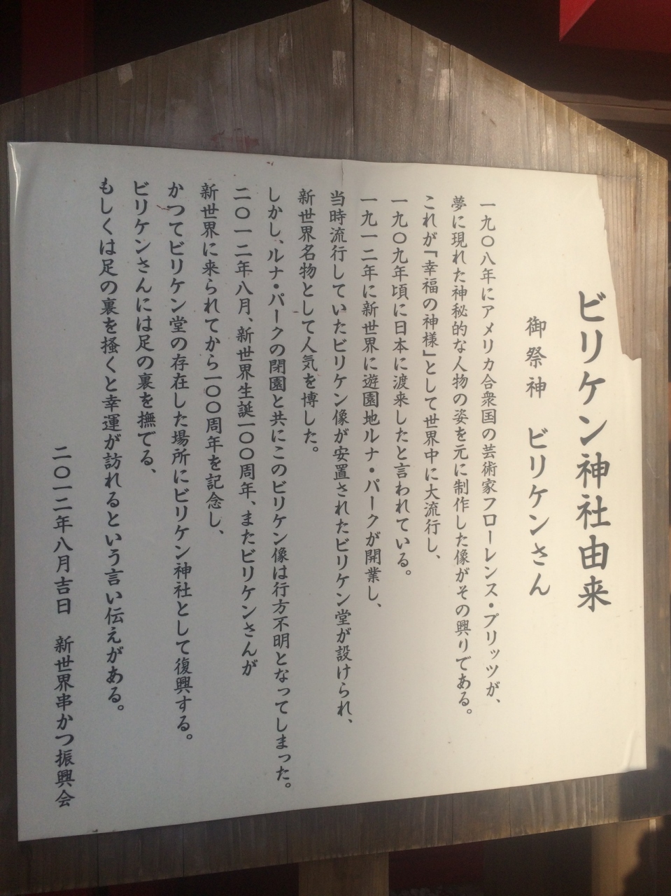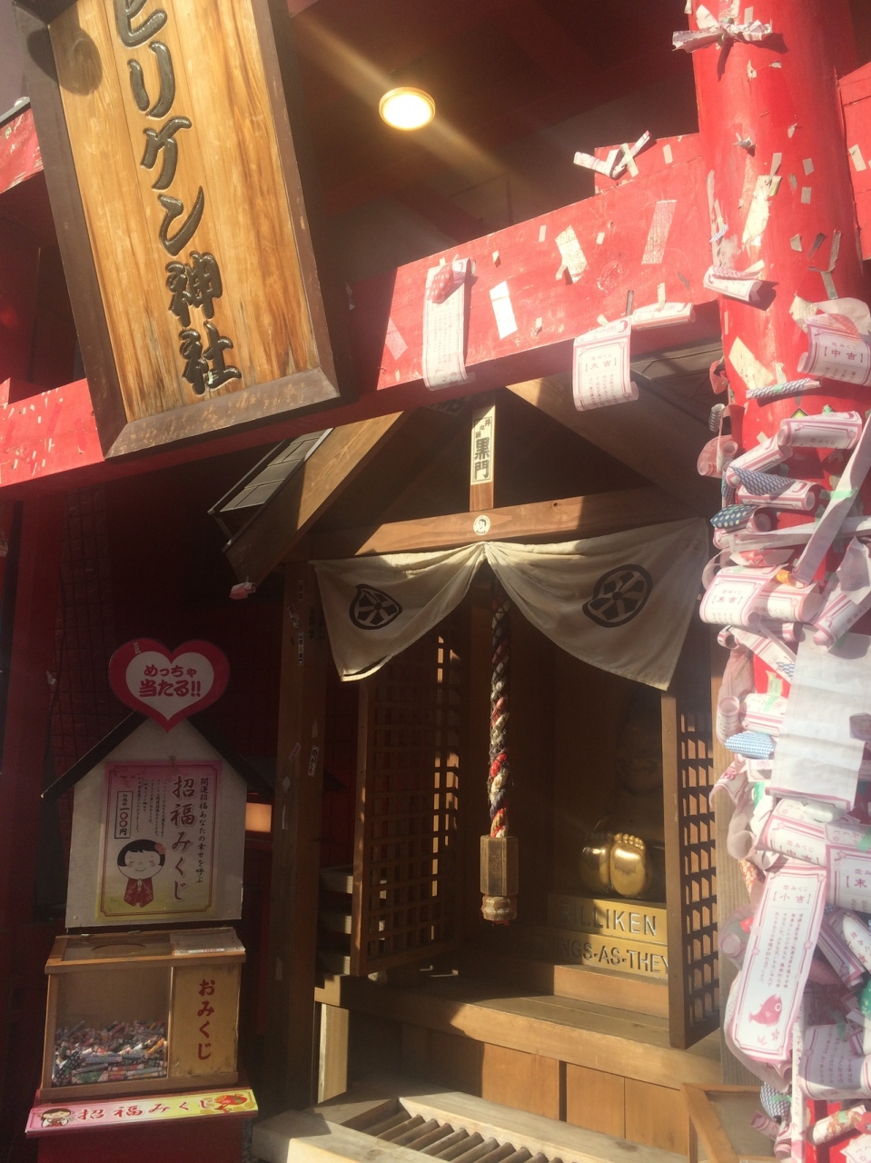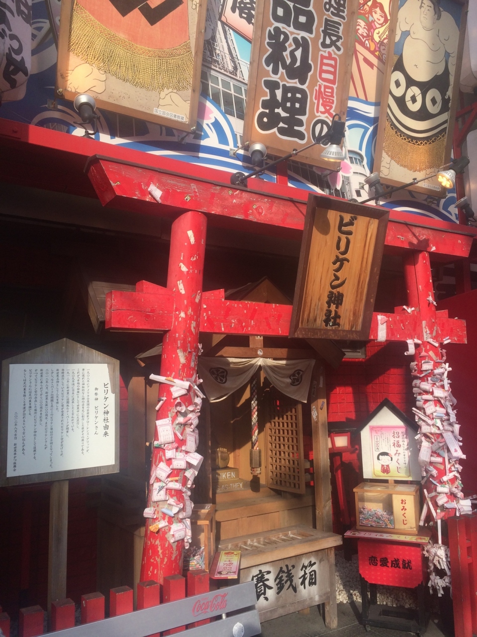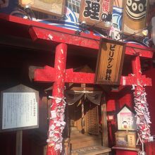通天閣を正面にして多くの観光客が写真を撮っている付近の横にあります。小さな神社で、神社らしくなく模型のような感じでしたが、お賽銭箱もあり、おみくじがたくさん巻かれていました。中央には、ビリケンさんが祀ってあり、目が細めでした。