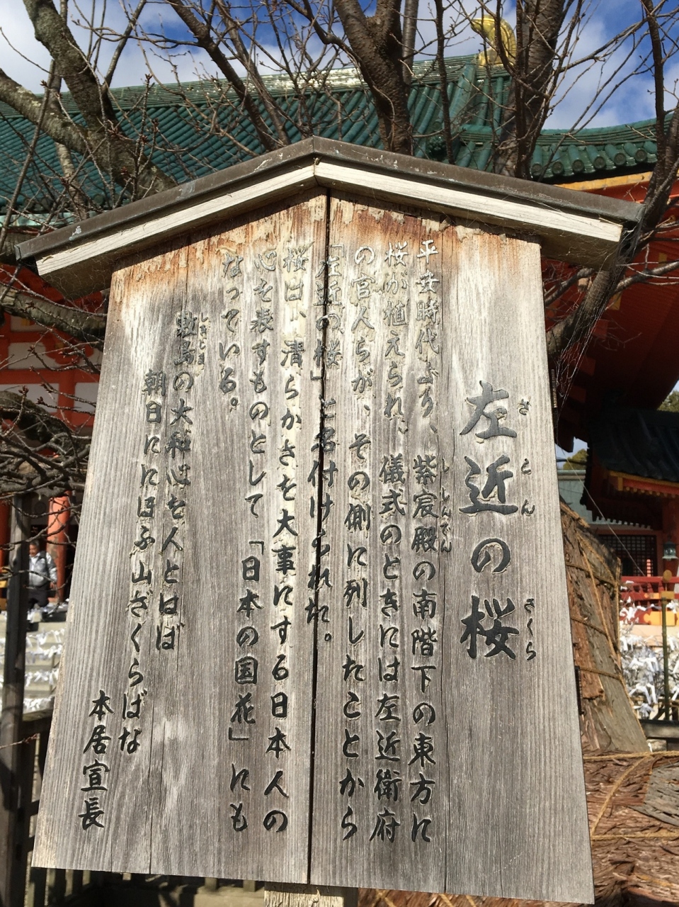 入母屋造りの大きな屋根に金色の鴟尾が輝いていました。前には、左近の桜と右近の橘がありました。橘は、おおいがしてありましたが、桜はおおいもなく、前庭にその存在感を示していました。建物と一対の木です。解説もありました。