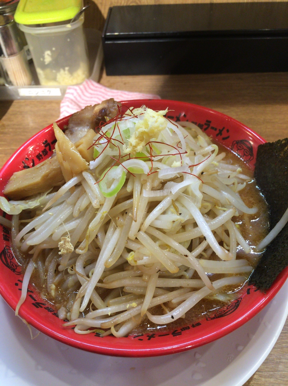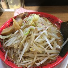 二郎系列のラーメン屋には初めて入りましたが、やはり大盛に盛られたもやしと特大のシナチク、鶏肉がインパクトのあるラーメンだというのが印象に残っています。野菜の下に麺が埋まっており、麺にたどり着くまでに野菜を消化しないといけないので、食べている間にだんだん飽きてきてしまうのが難点。麺にはスープの味がしみ込んでいて美味しかったですが、野菜の量をはじめ好みは人によって分かれそうです。