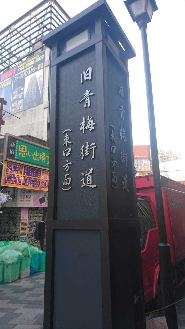 江戸時代初期に、江戸城建築用に西多摩地方の石灰を運搬するため、現在の新宿から青梅まで開かれた街道が旧青梅街道です。そのため、新宿駅の周辺にはあちこちに旧青梅街道の標識が設置されていました。私はユニクロ新宿西口店のそばにある標識を見つけました。