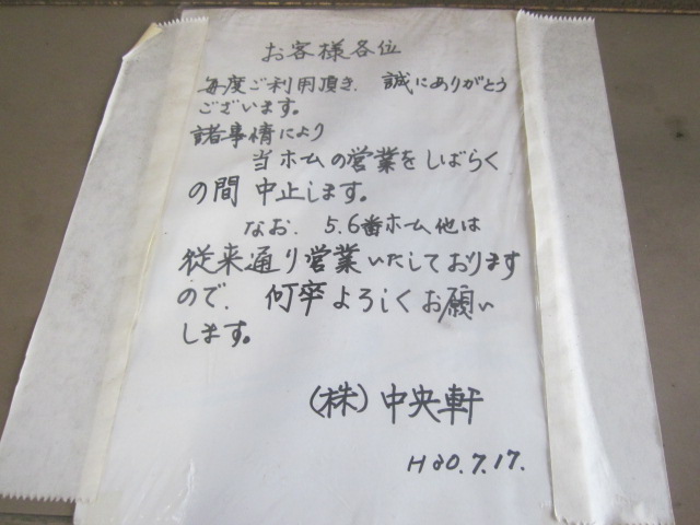 小倉駅と同様、かしわうどんが名物となっていて、駅弁も販売しているので、北部九州の交通の要衝として、個人的にも立ち寄る機会が多いお店ですが、今回は、サクッとかしわうどんでも食べていこうかとホームに立ち寄ると…。???、お昼なのに閉まってる…。正直、お店が閉店してしまったのか、不安になりましたが、向かいのホームのお店は営業していました。こちら側の閉店は人員削減なのか、たまたまスタッフの方の体調不良か何かだったのか、よくわかりませんが、一日やそこらの話ではなく、暫く休業している風情でしたので、今後の中央軒のことが心配になりました。