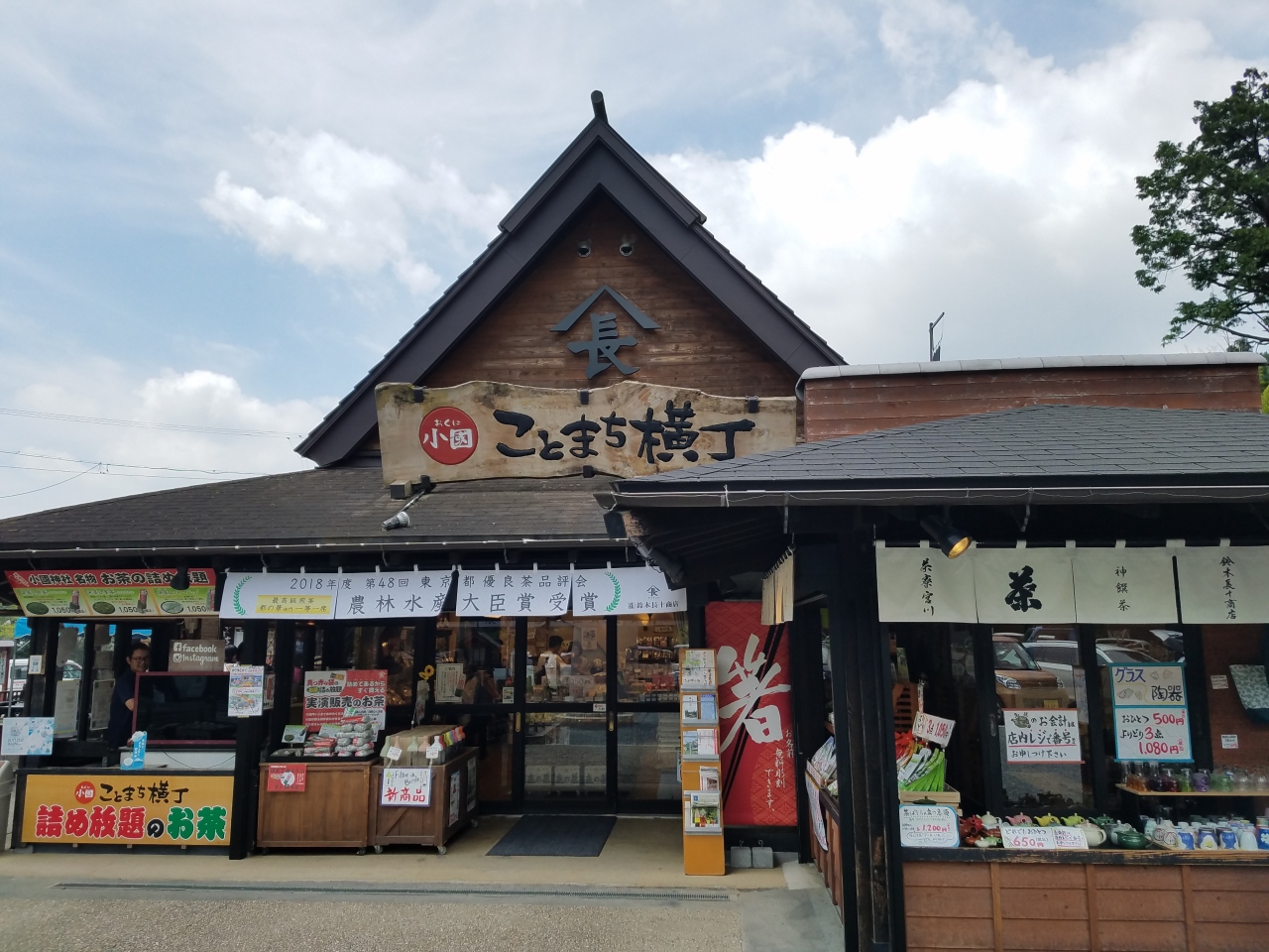 ことまち横丁は、小國神社の門前にある飲食店やお土産店が集まるスポットです。まだ真新しい施設で、遊歩道やお店の建物は綺麗で気持ちがよい横丁です。有名銘茶店ではたくさんの種類のお茶が並べられ、店内ではお茶の製造や歴史の紹介もあり、ためになりました。