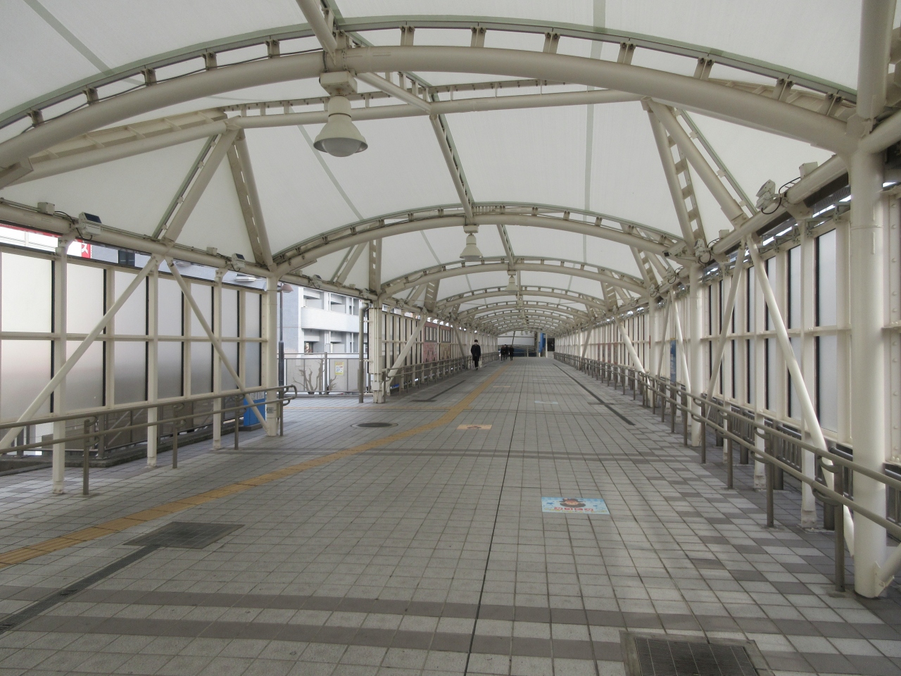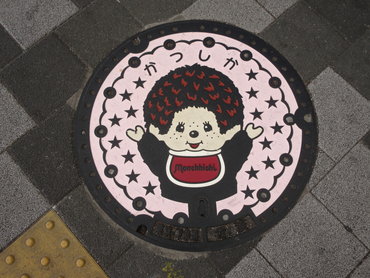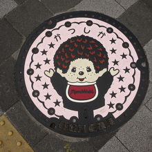 新小岩駅北口を出て工事中のフェンス沿いに歩いたところに明るい白い屋根の通路があります。エスカレーターにモンチッチのイラストがたくさんついていて、幅広い通路に「モンチッチに会えるまちかつしか」のかわいらしい説明板がありました。通路はバスロータリーの東北広場と新小岩駅北口をつないでいました。東北広場から駅へ向かう通勤通学の人が多く利用するのでしょう。説明板にひかれて東北広場にあるモンチッチのマンホールを見つけました。明るい屋根が気に入りました。
