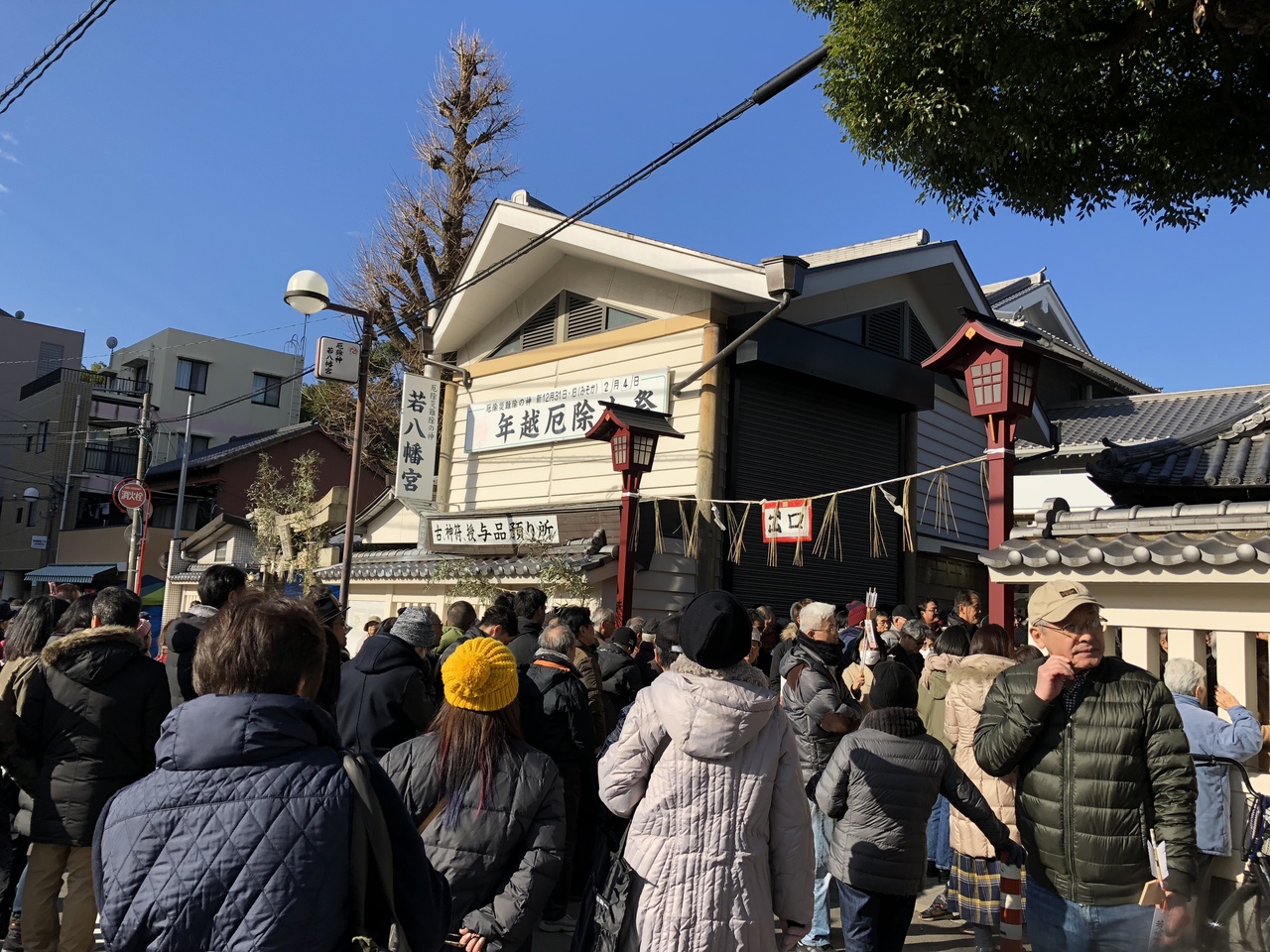 12月31日は人がい境内に入りきれず行列をなしていました。理由はおまもりやお札などをひきとってくれるからです。ゴミとして出すには少し気がひける神社にて授与されるものを引き取っていただけるのは、とても有り難いです。境内外の路地では如水庵の臨時テントがでていて、縁起物のお菓子を販売しています。他にも出店がいくつかでていました。