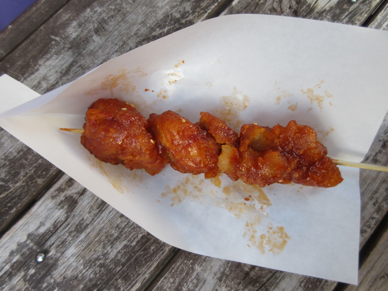戸越駅から戸越銀座商店街を東へ歩いたところにある唐揚げ屋です。定番の唐揚げからハワイアン風や韓国風の唐揚げがいろいろあります。店内で座って食べるスペースがありますが、ほとんどの人が食べ歩きしていました。店頭の韓国風甘辛ももから揚げ串は食べやすさから売れていました。自分もこの串を買いました。始め甘く唐辛子辛さが後から追いかけてくるような唐揚げでした。冷めていて出来立てではなかったのが残念でした。
