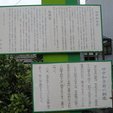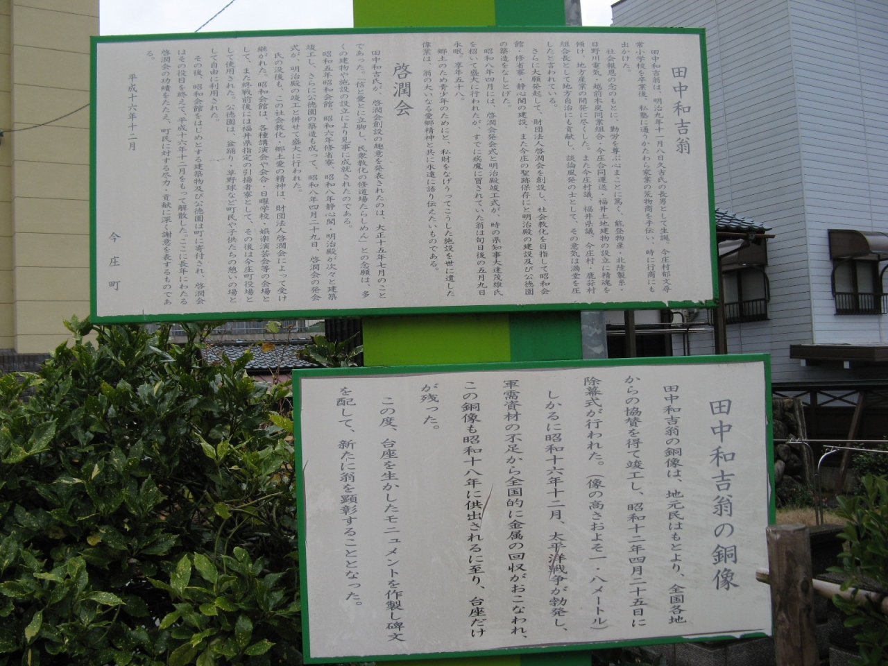 なお、建物前の庭には、田中和吉氏を顕彰する立派なモニュメントがあります。現地にある説明板によると、もともと田中和吉氏の銅像があったそうですが、太平洋戦争時の金属回収により銅像が回収されたため、もともとあった台座を生かしてモニュメントとして再興したものだとか。