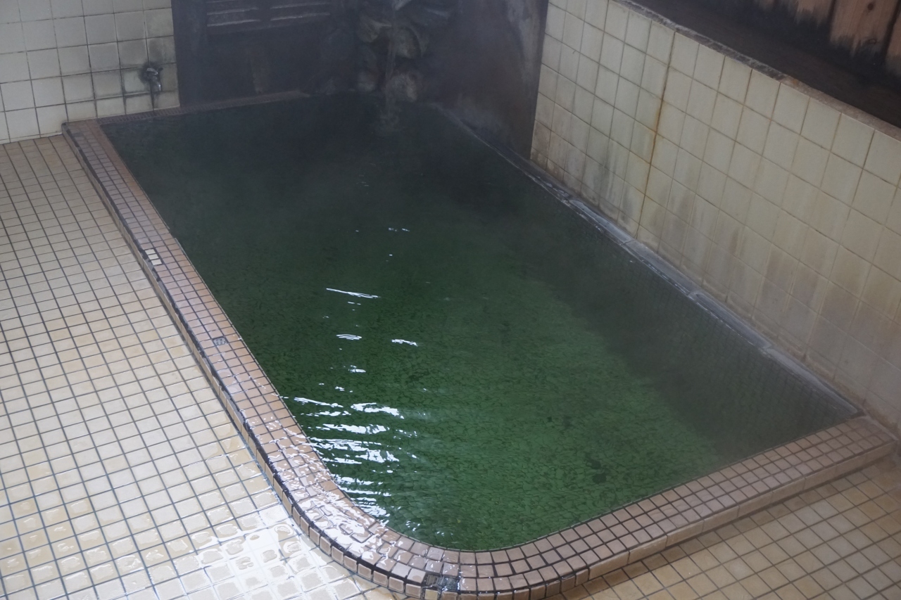 滝の湯は、麻釜からさらに奥。少し急な坂道を上った先なので、外湯の中ではここが一番不便な場所かもしれません。扉を開けるとジャバジャバと水の音。誰か入っているのかなと思ったら、それは湯舟に流れ込む湯の音でした。これはかなりのかけ流し感ですね。そして、もう一つの大きな特徴は湯の色。バスクリンみたいな鮮やかな緑の色です。よく見ると黒い湯の花が浮いていて、湯の花は熊の手洗い湯と似ていると思いました。