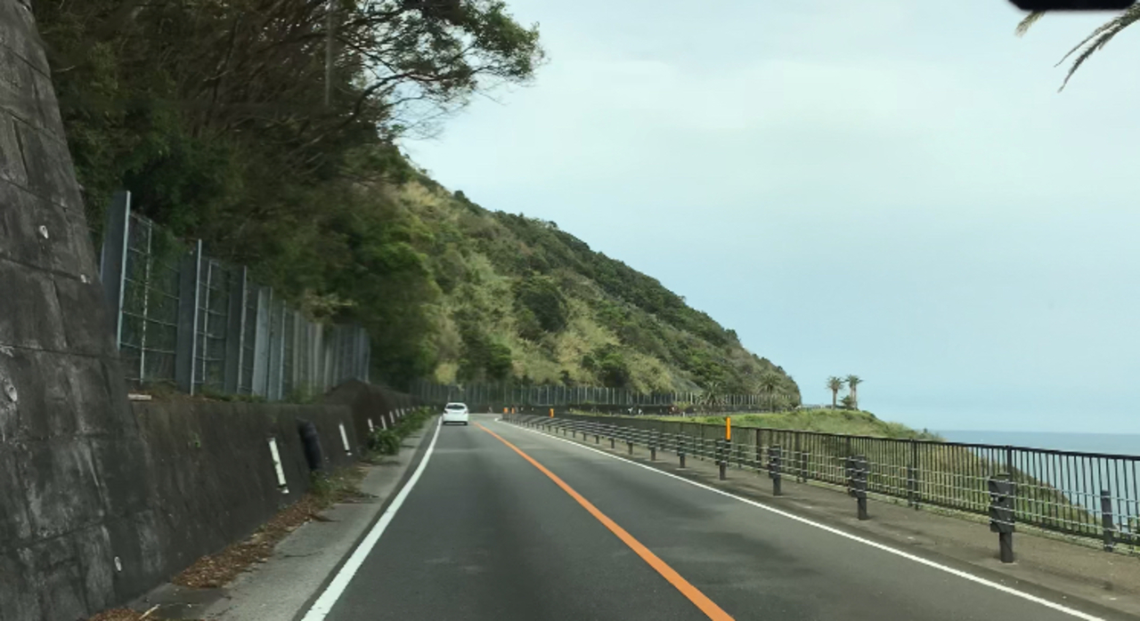 日南海岸沿いを通っている国道220号線の愛称です。トンネルに入る箇所もありますが、海岸沿いを通っている区間が多く、鬼の洗濯岩が見えたりと景色が素敵な道路でした。あいにくの曇り空だったのですが、晴れたら海の色もきれいなのだと思います。
