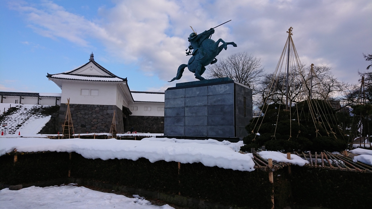 霞城公園の濠を渡り、東大手門から城内に入ると、この騎馬像が目に留まりました。手綱を強くひき、2本脚で立つ馬にまたがった勇壮な姿です。V字のかぶとがかっこよく、通りがかる人がみんな写真を撮っていました。