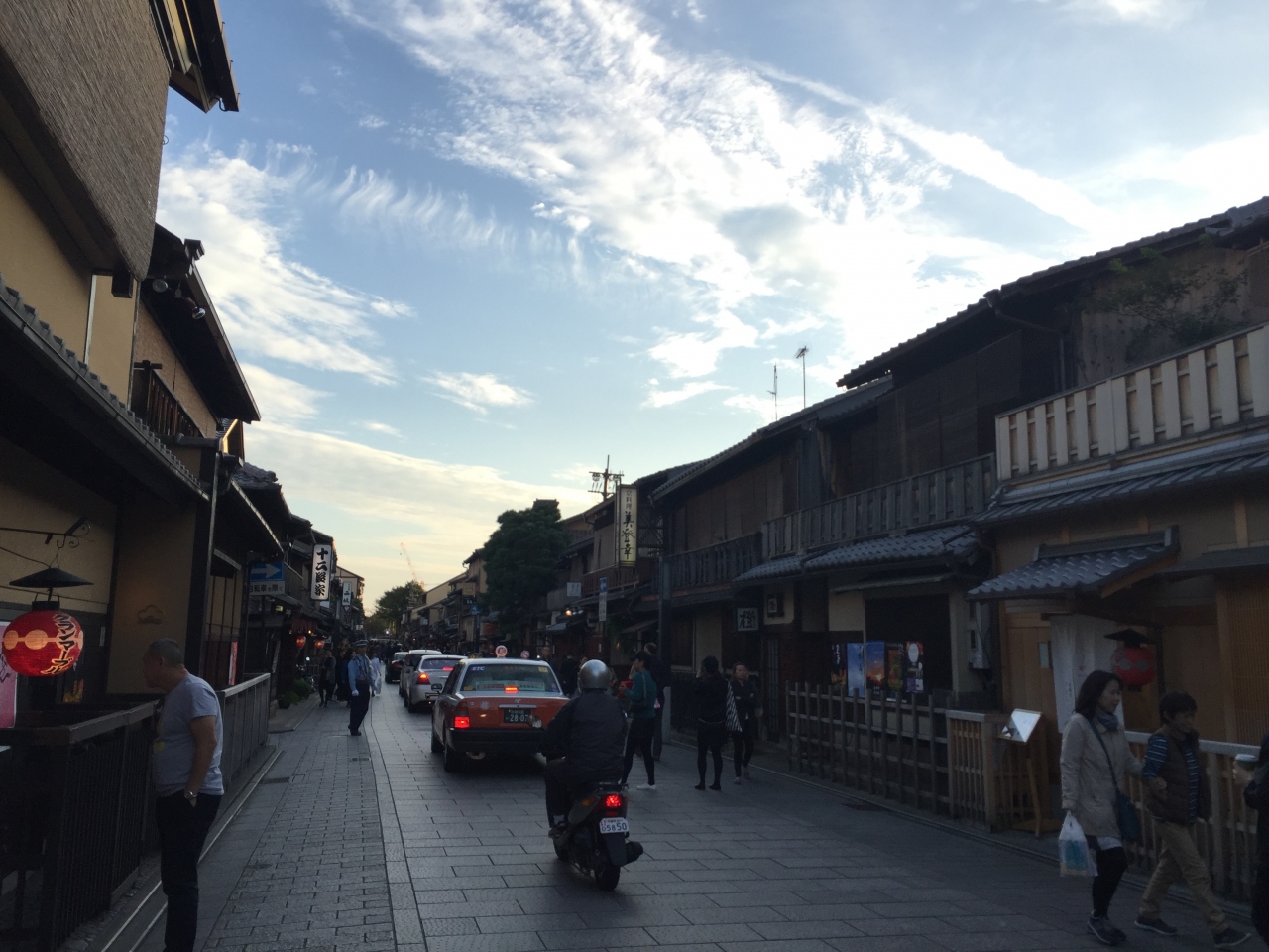 古い街並みが残る、京都で大人気の場所です。舞子さんや芸者さんが良く見かけられる場所でもありますが、私は何度来ても一度も遭遇したことがありません。この日も観光客ばかりでにぎわっていて、混雑していました。一見入りずらそうな店ばかりですが、外のメニューを見てみると、観光客向けの適度な値段のお店も多いです。