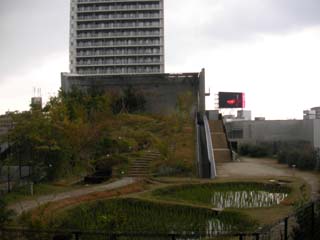 田園都市線の池尻大橋駅の地上に出ると大橋ジャンクションから延びる首都高速が空を覆っていて、歩道橋から続く道を進むとジャンクションの上に出来た目黒天空庭園が続いていて、ゆるやかに上っていくと1周回ってテラスに出て晴れた日には富士山が見えます。中はオーパス夢ひろばで、田圃やフットサル場があり、隣のビルの図書館につながっていて、エレベータでも上がることができます。