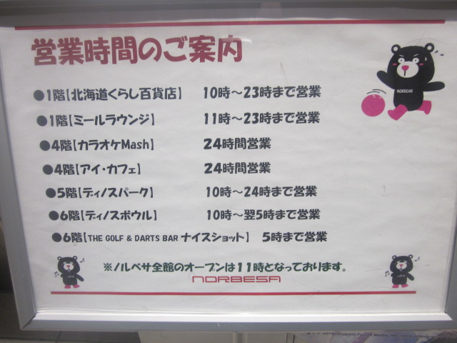 観覧車があることで有名なノルベサで、ビル内には様々な業態の店舗も入店していますが、それぞれの営業時間が結構異なっているので注意が必要です。4Fのネットカフェやカラオケは24時間オープンなのに対して、それ以外の階は大体10時から、全館オープンは11時からとなっていますので、特に、6Fのアミューズメント施設の営業が終わる午前5時位から午前10時位までは、1Fが施錠されていて(あるいは清掃作業中などで)入れないことがありますので、エレベーターがある入口側まで遠回りさせられることがあります。天気の良い日なら問題ないのですが、これが吹雪いている日とかだと、凄く損した気持ちになりますので、出来るだけ吹雪の日の朝は時間をずらして訪問するなどの対策をたてられた方が良いかなと思います。(最近は、このノルベサ前から千歳のアウトレットモール・レラまでの直行バスに乗ることも出来ますが、バスの発車時刻(2019年1月時点で9時45分)には、まだ1F店舗が営業していないので、冬は入口傍のスペースで立ってバスを待たなくてはならない(ベンチなどの据え付けもありません)のが辛いところです。