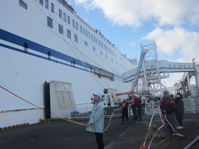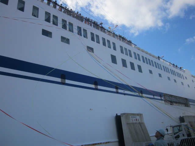 ここでは車両積み込みの問題で、少々出航が遅れましたが、船上からは別れの紙テープが沢山投げられて、この光景ももう涙・涙・涙でした。