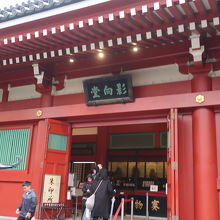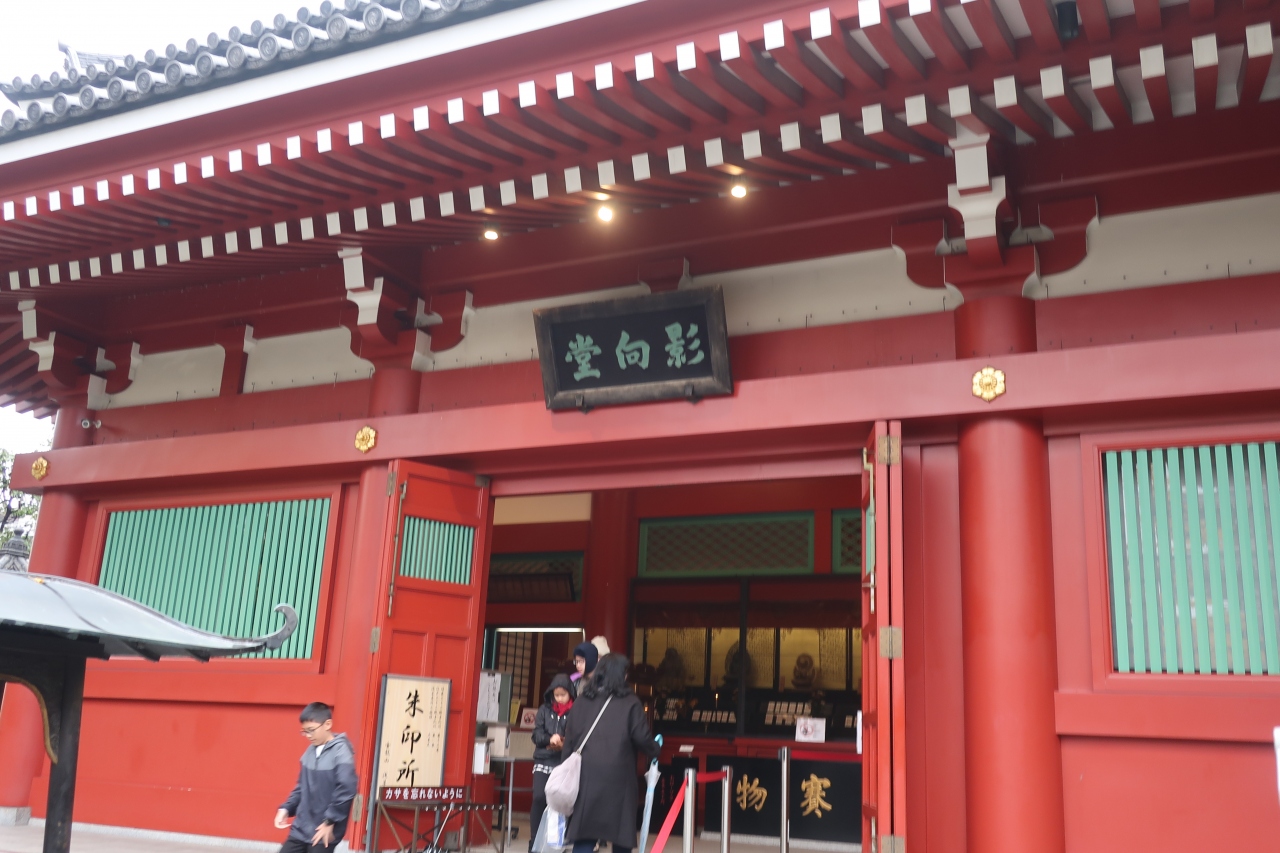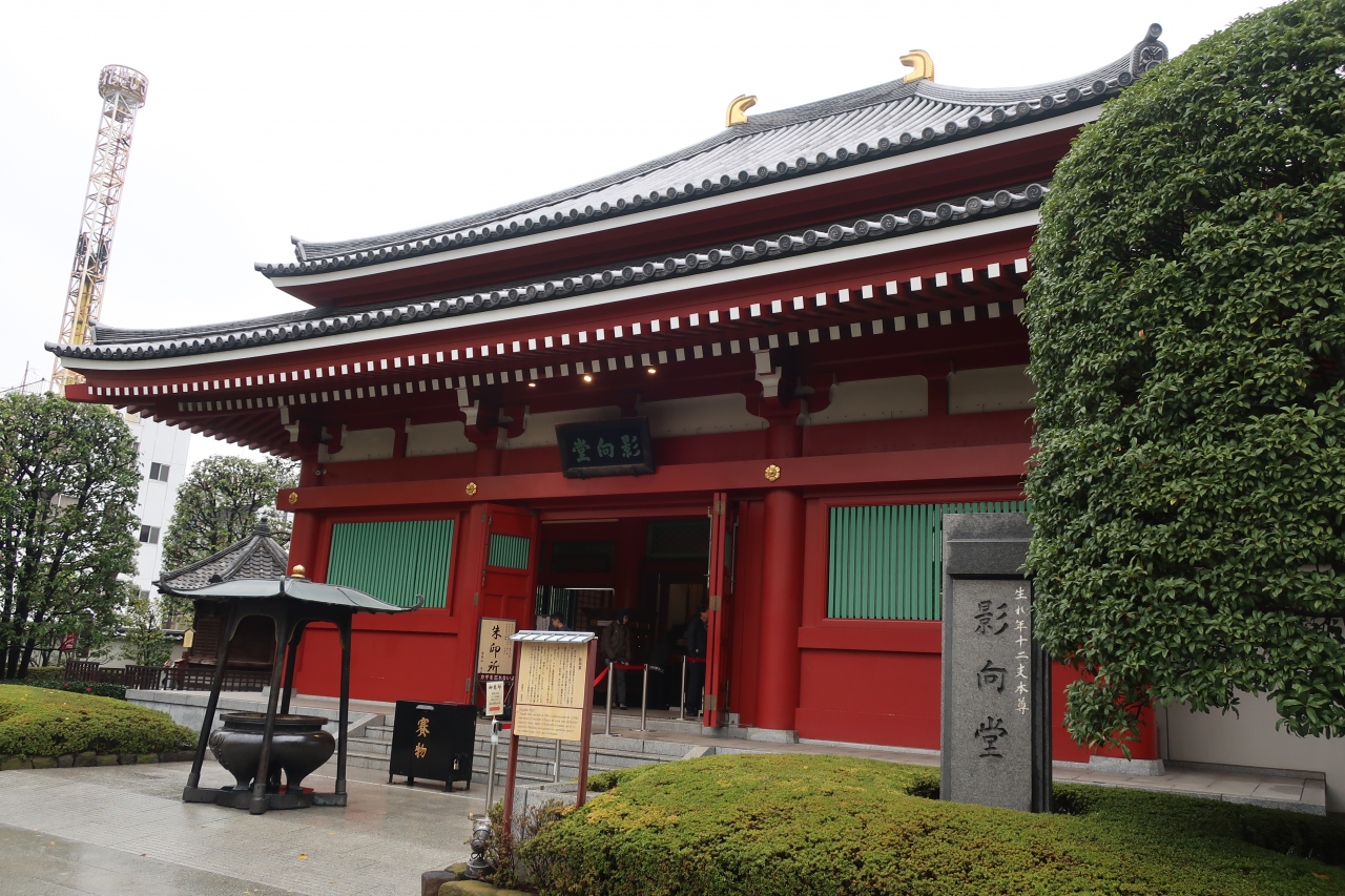 浅草寺の境内、本堂の北西部に建つ屋根上に鴟尾を載せた鉄筋コンクリート製の赤いお堂があります。これが影向堂です。建物自体は25年前に建てられた物で大したことはありませんが、お堂の中には観音菩薩を中心に生まれ年十二支本尊と呼ばれる八体の本尊が黄金色の壁の前に並んで祀られています。自分の生まれ年の仏様にお参りすると良いことがありそうです。